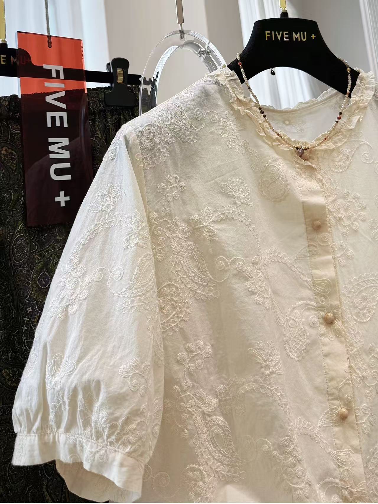 레트로 자수 화이트 거품 소매 여성 셔츠 2026 새로운 루즈핏 5 점 소매 외국 가스 작은 셔츠 벌룬 소매 맨위