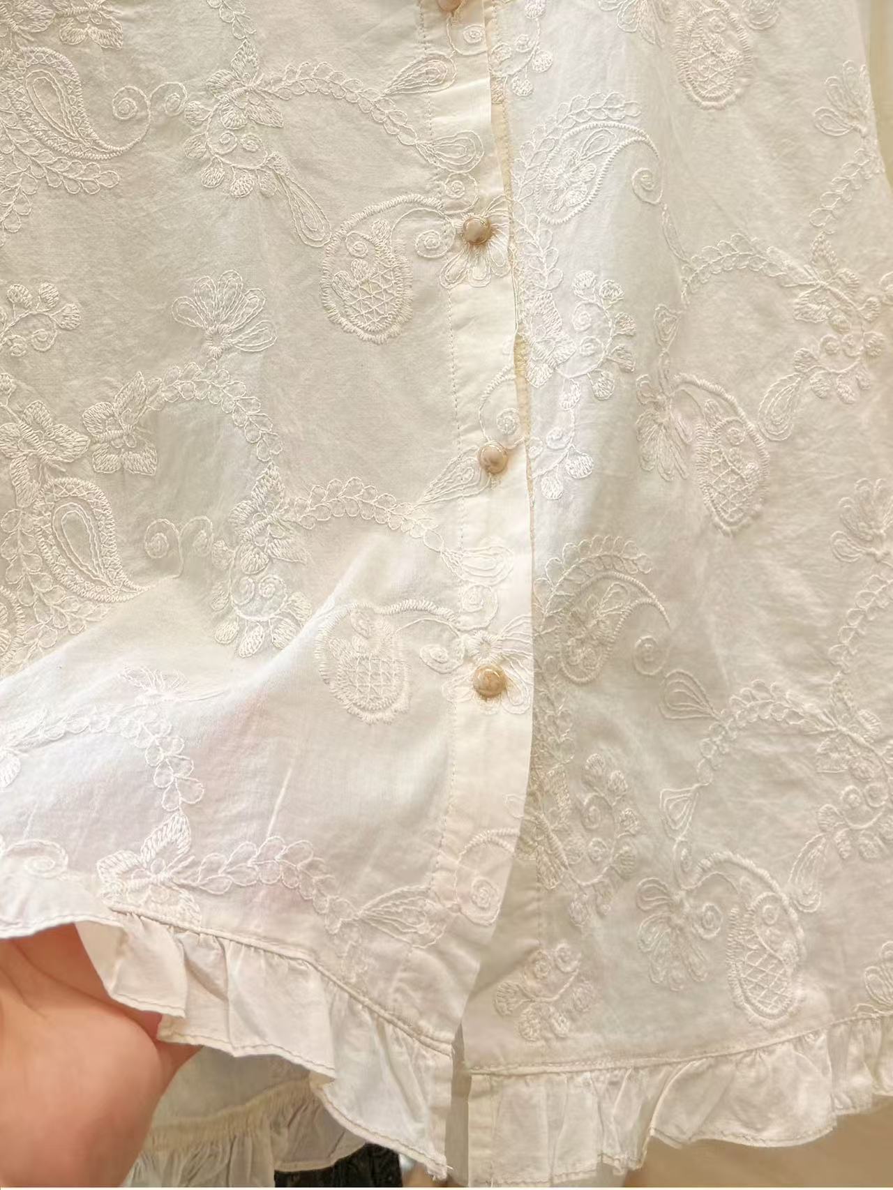 고급 센스 슈퍼 화재 연령 감소 순면 자수 한 부서 프릴 라운드 넥 반팔 여성 셔츠 여름 작은 셔츠 맨위 얇은