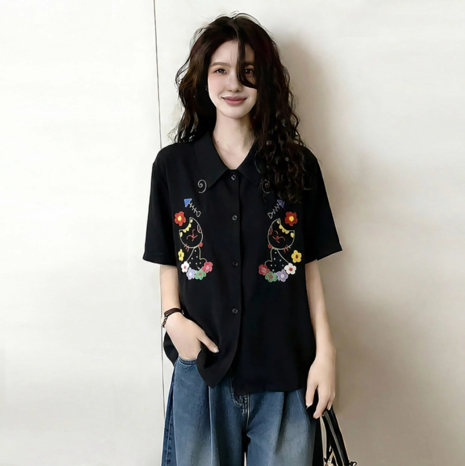 디자인 센스 새끼 고양이 자수 반팔 티셔츠 여성 2026 새로운 여름 빅 사이즈 지방 mm 표지 배 슬림해 보이는 긍정적 인 어깨 의류