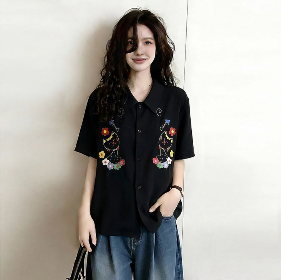 캐주얼 연령 감소 배색 자수 자카드 여성 셔츠 여름 빅 사이즈 통통한 여동생 레트로 품격 슬림해 보이는 표지 고기 맨위