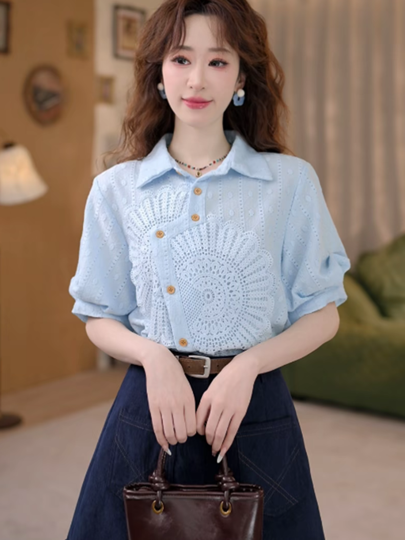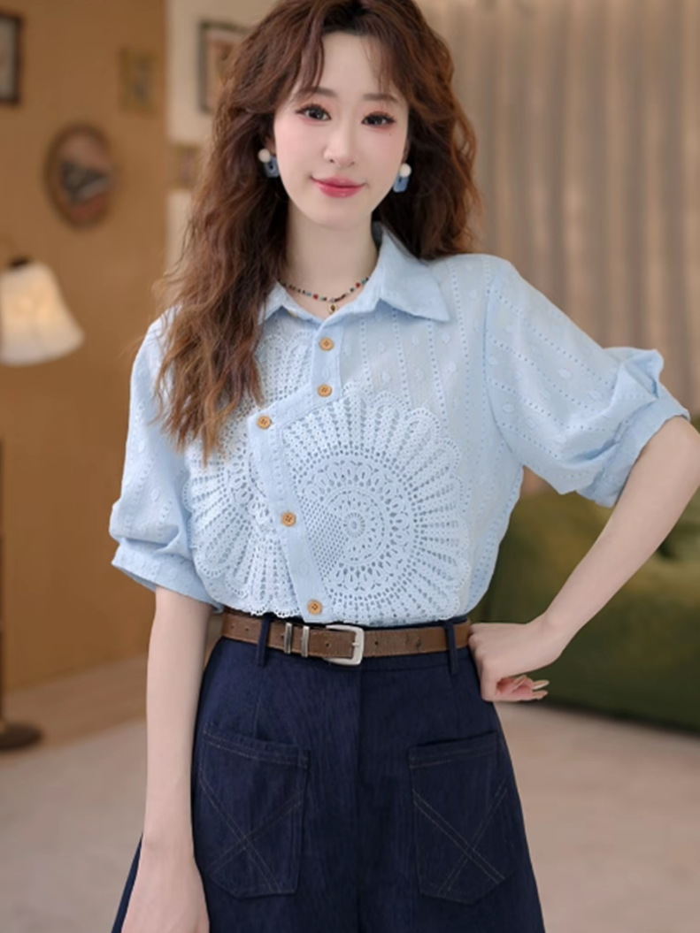 멀리 웨이브 떠 다니는 섬 레트로 레이스 조각 페이크 레이어드 루즈핏 다용도 여름 셔츠