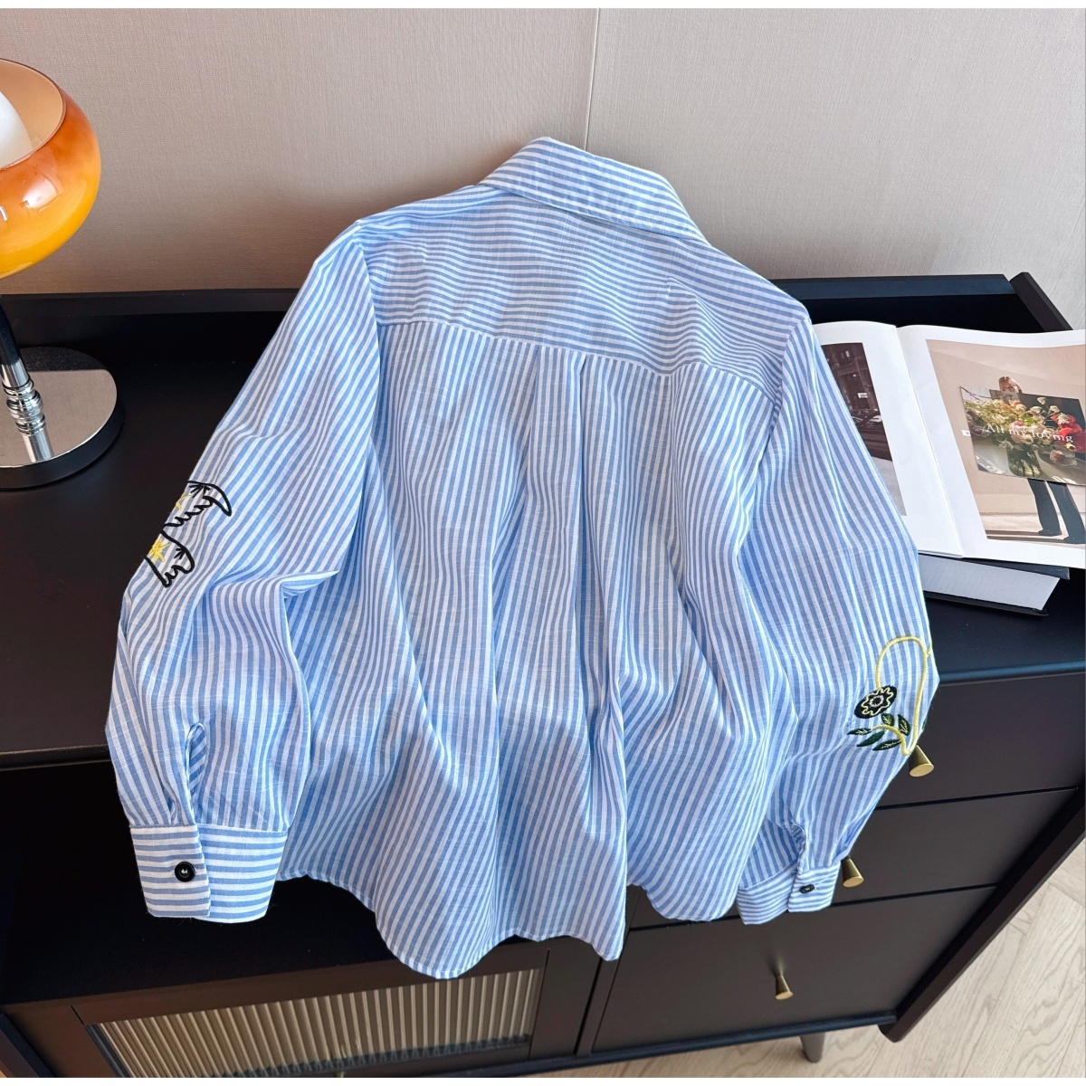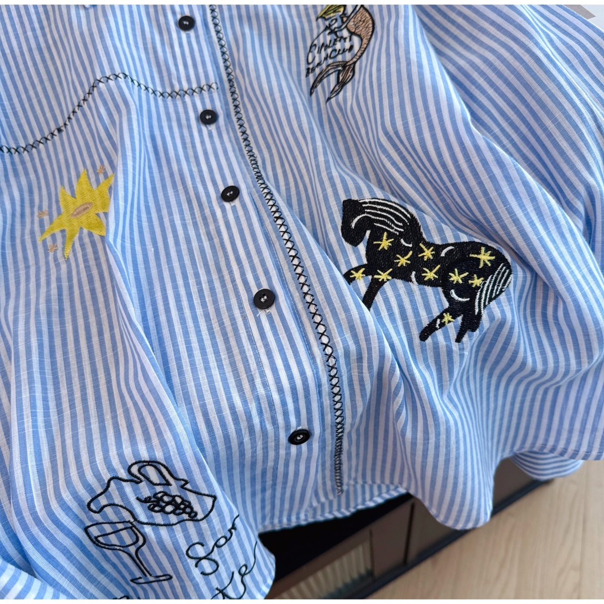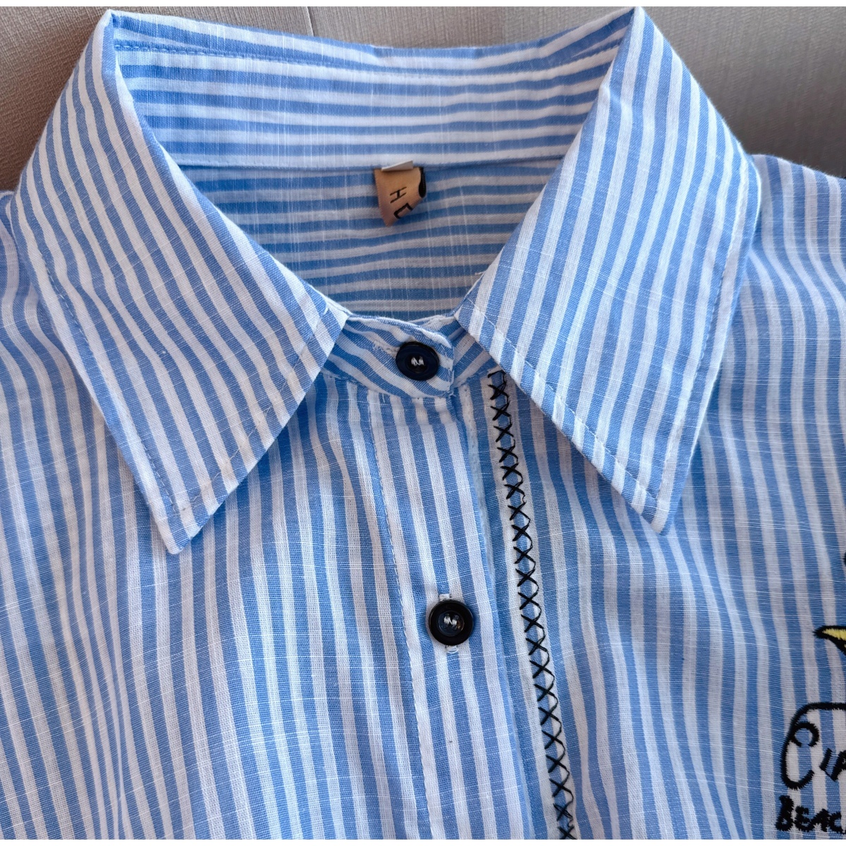 실사 재고 있음 느긋한 느슨함 센스 파란색 스트라이프 만화 자수 셔츠 루즈핏 빅 사이즈 스택 착용 긴팔 맨위