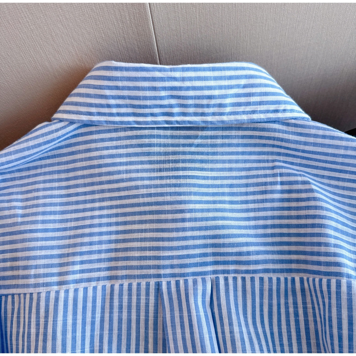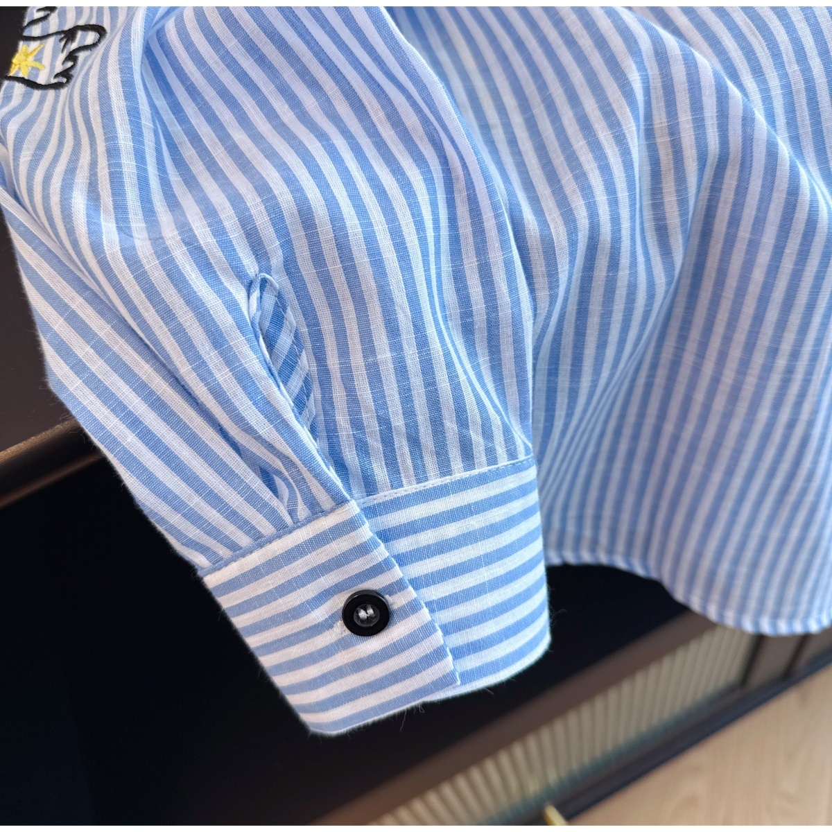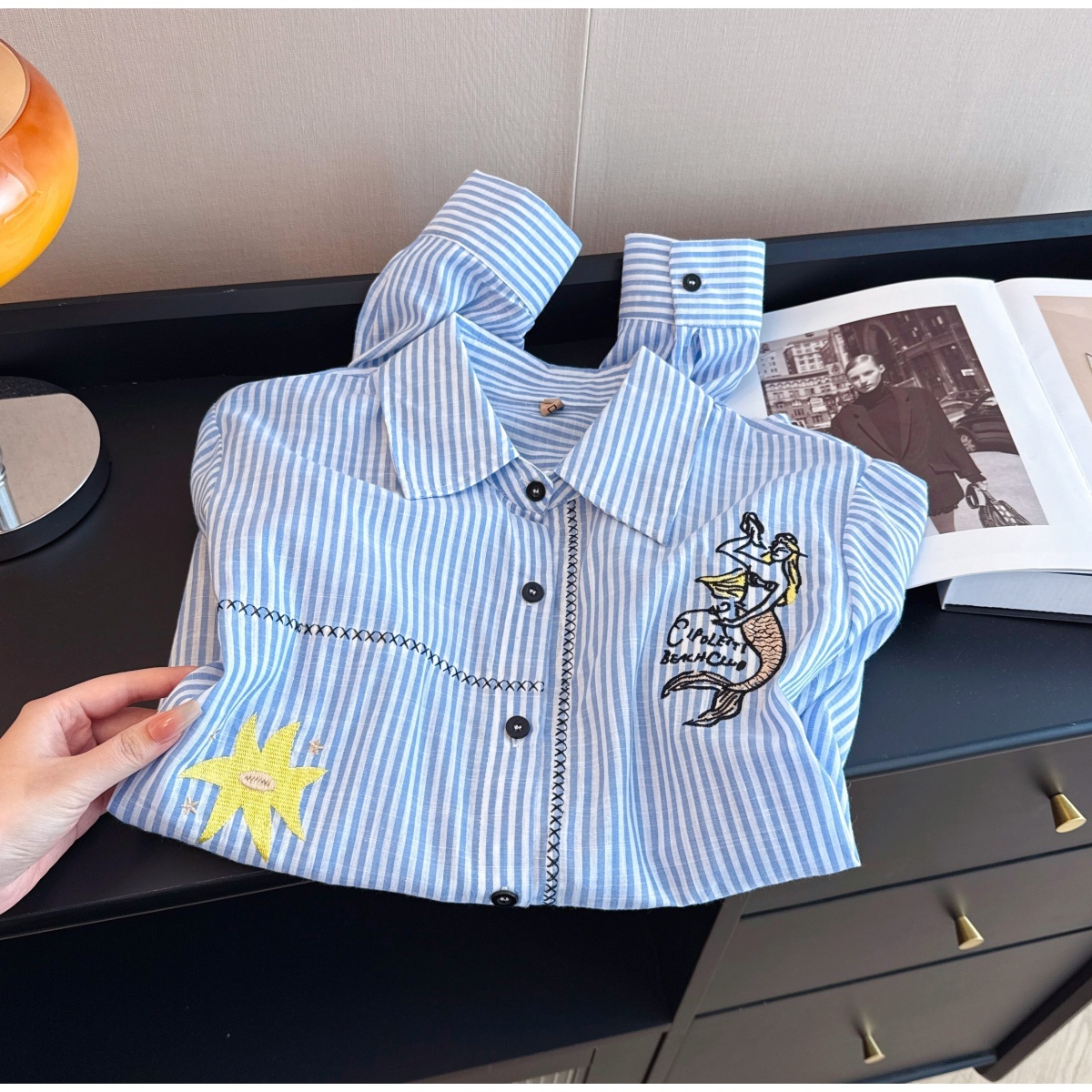 실사 재고 있음 느긋한 느슨함 센스 파란색 스트라이프 만화 자수 셔츠 루즈핏 빅 사이즈 스택 착용 긴팔 맨위
