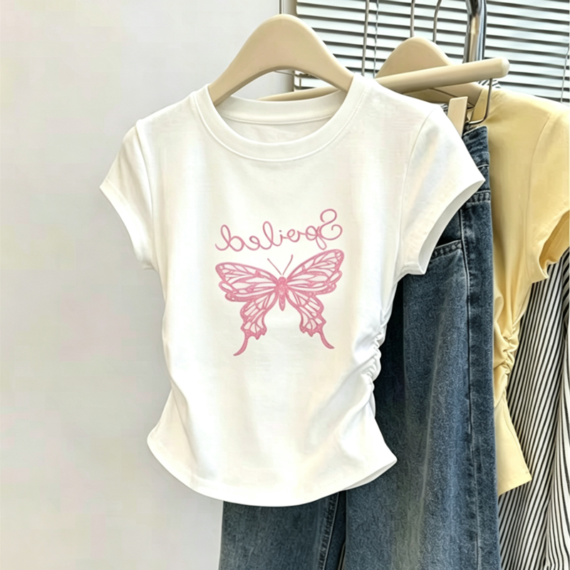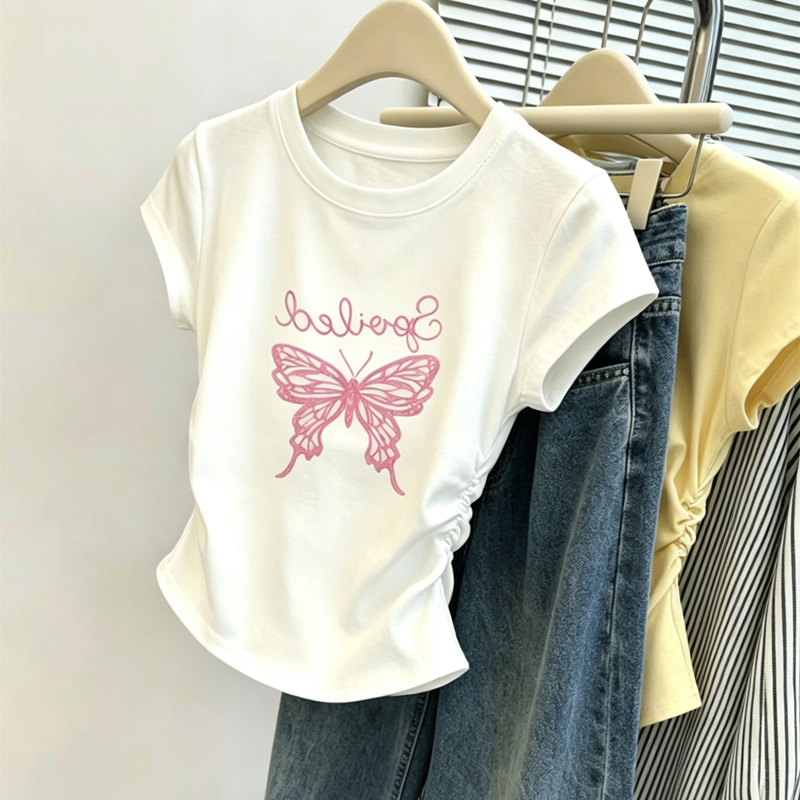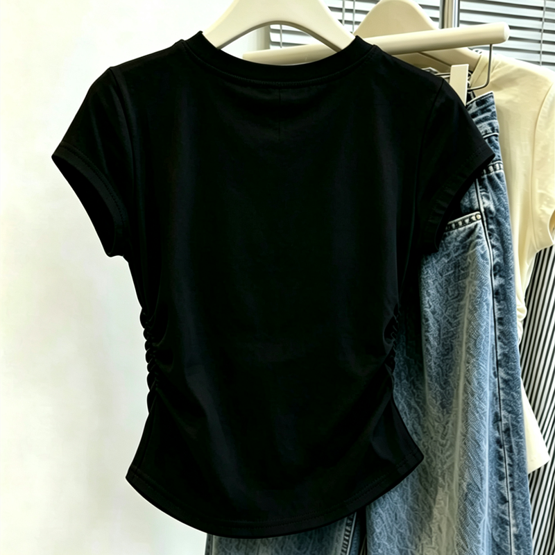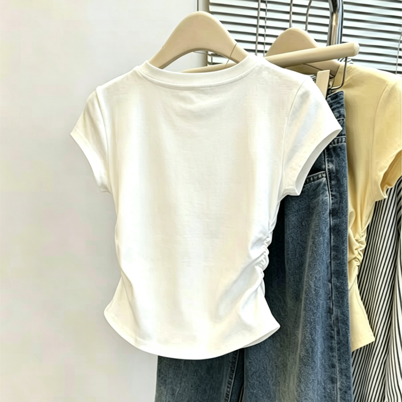 1x1 사람들 면 와 사고 방식 260g 빅 사이즈 Feifei 소매 티셔츠 여성 여름 새로운 2026 년 주름 허리 수축 맨위