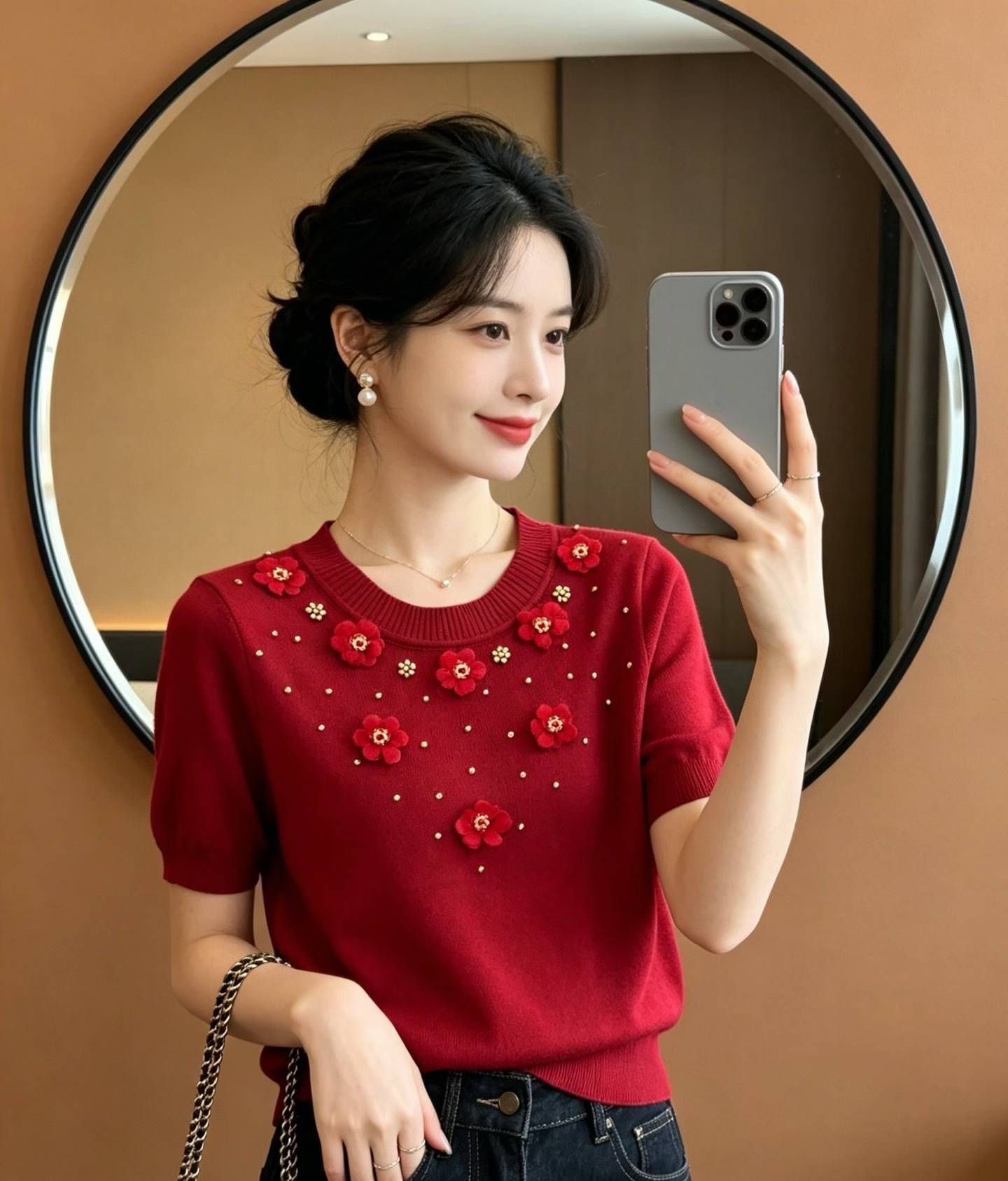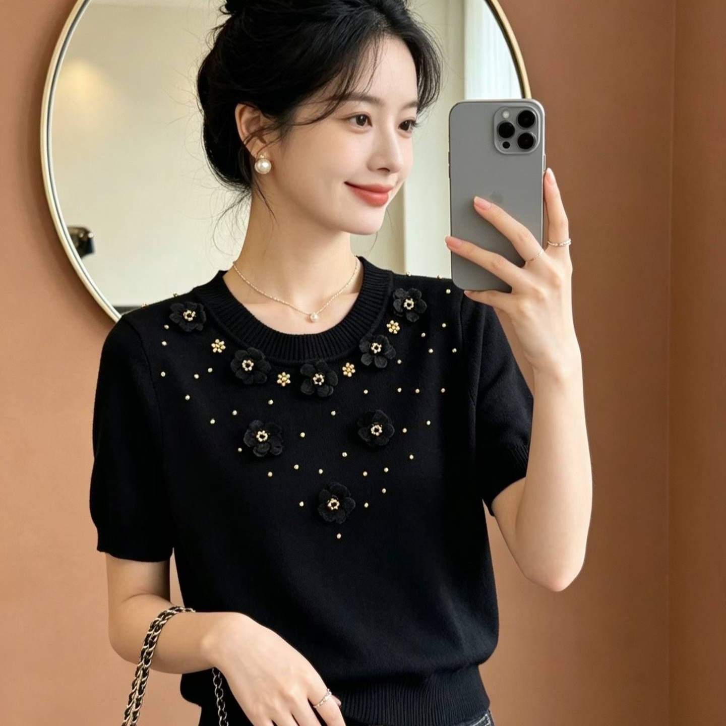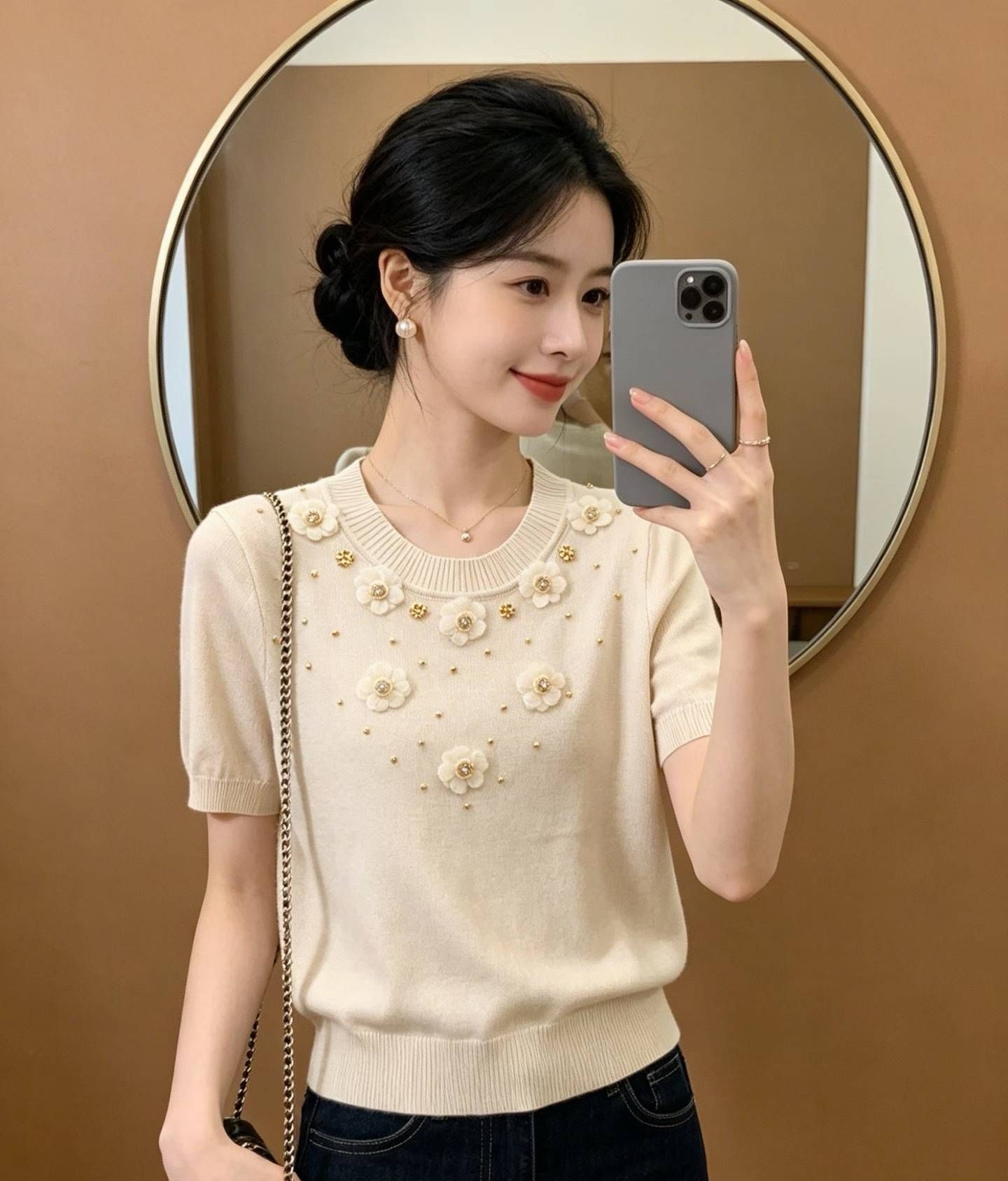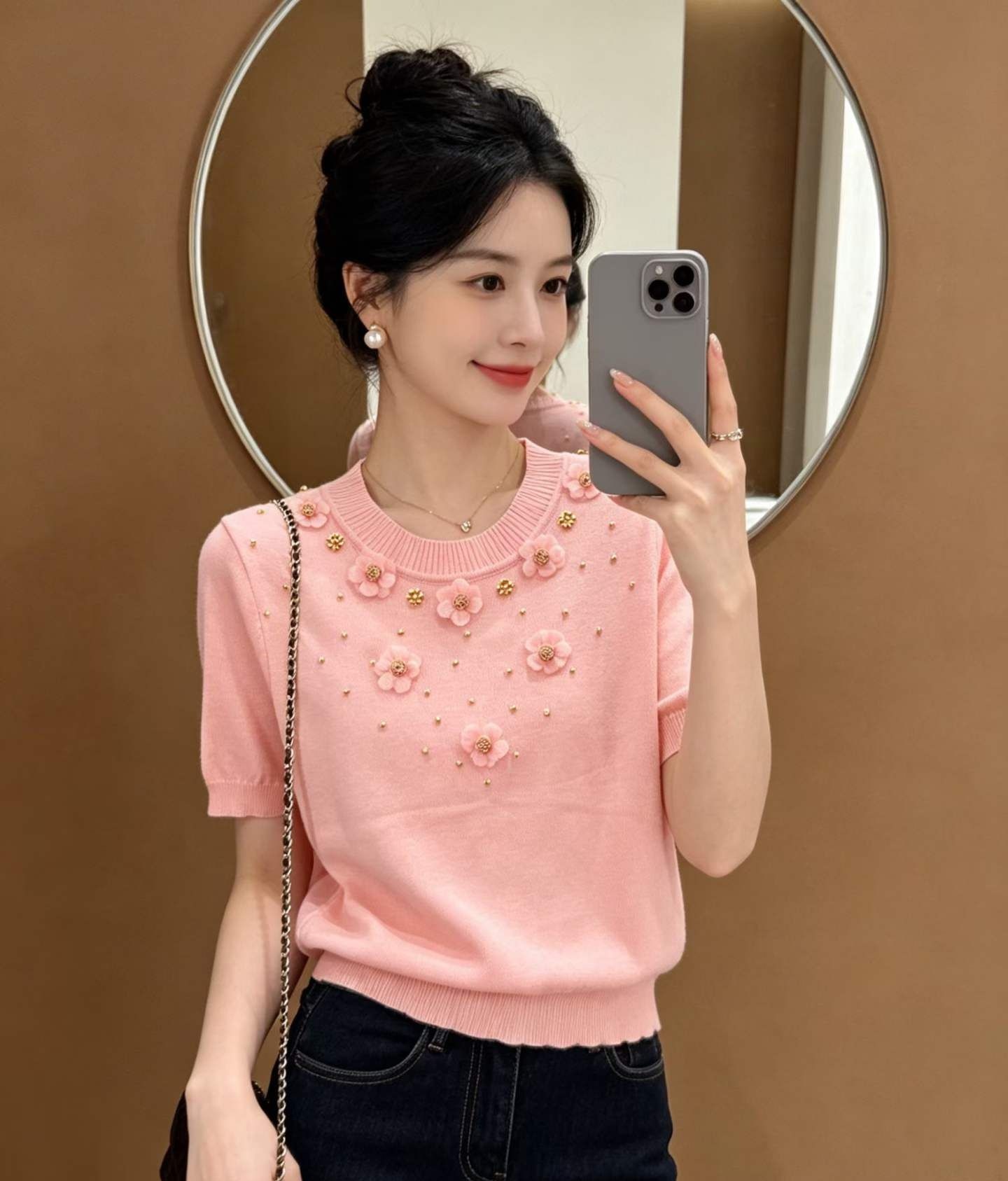 2026 년 여름 새로운 디자인 센스 한 부서 부드러운 달콤한 자매 바람 3 차원 꽃 비즈 박기 꾸밈음 풀오버 반팔