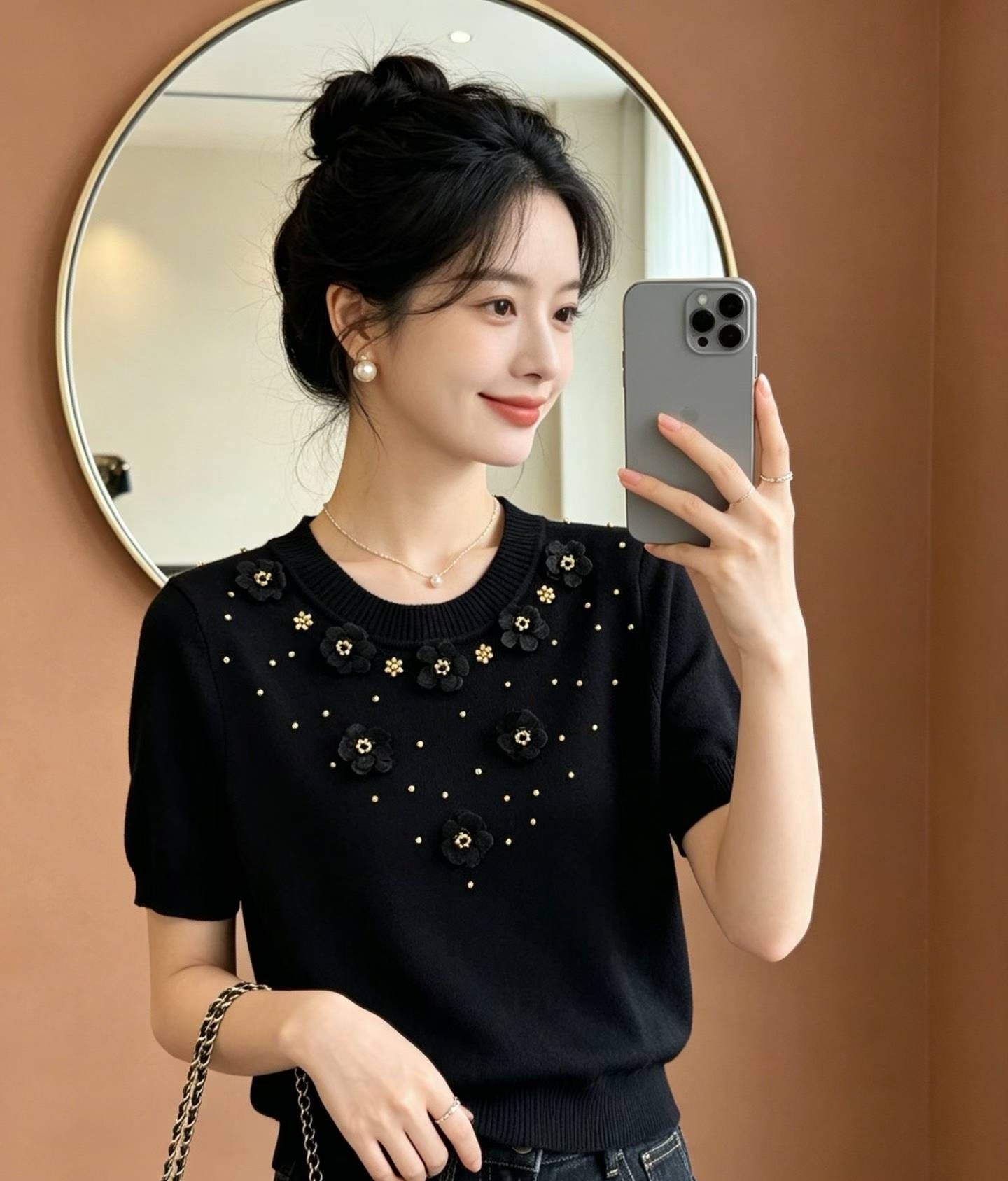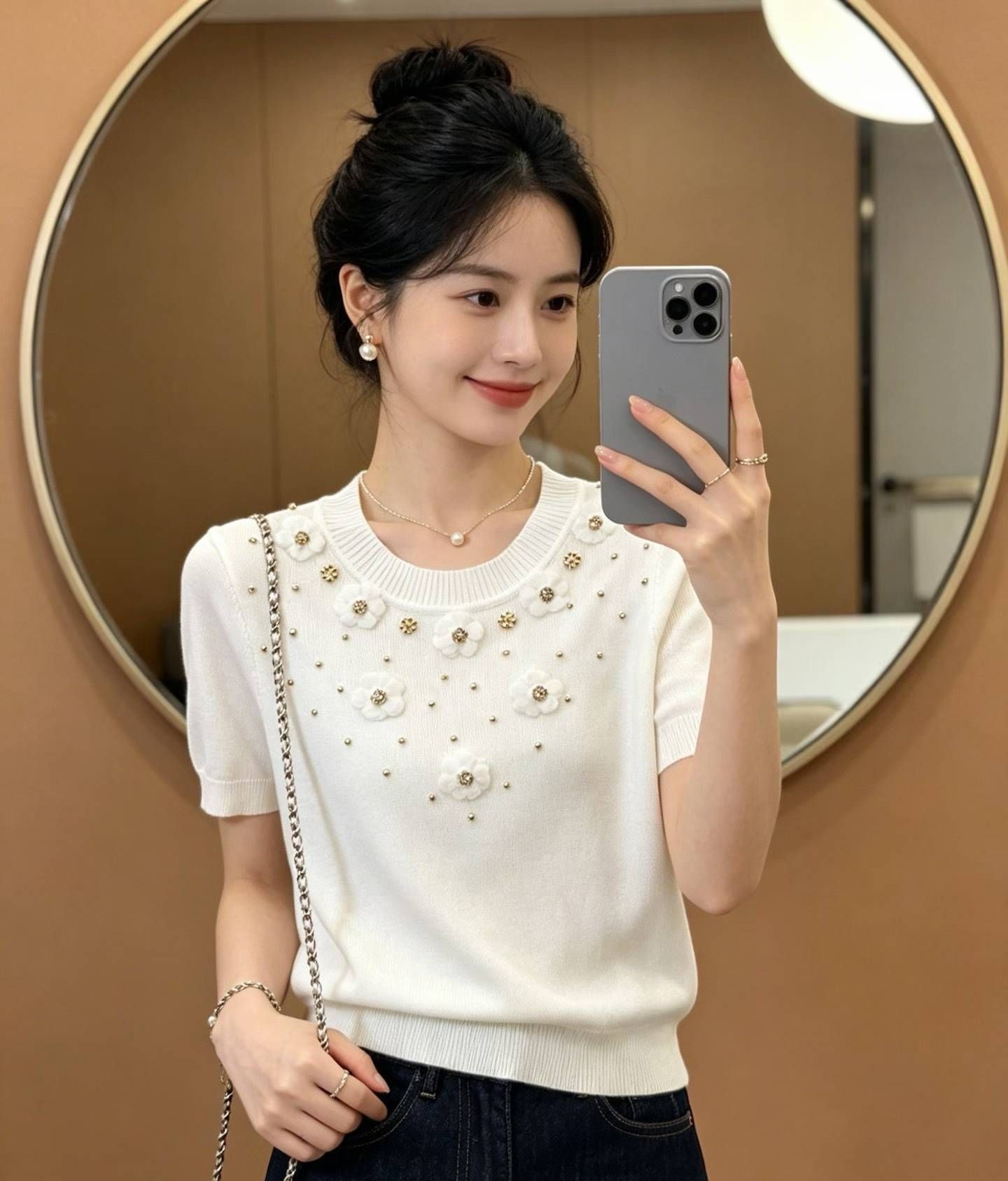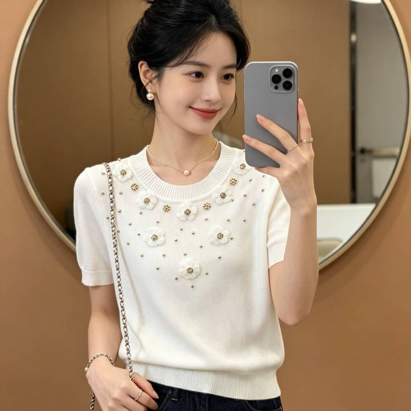 2026 년 여름 새로운 디자인 센스 달콤함 작은 샤넬 스타일 베이비 칼라 나비 매듭 3 차원 꽃 비즈 박기 니트 반팔