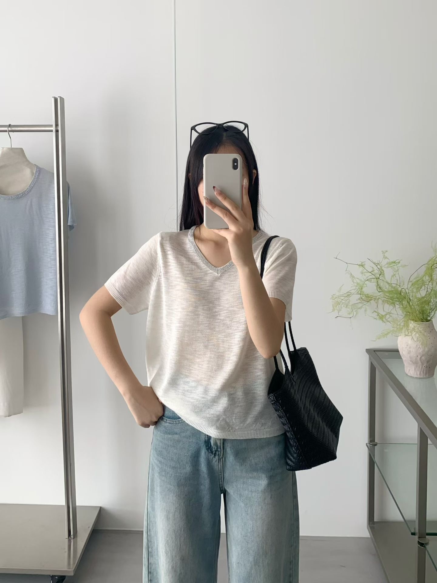 여성 의류 2026 여름 새로운 V넥 다이아몬드 세팅 반팔 티셔츠 지방 mm 다용도 루즈핏 맨위 여성