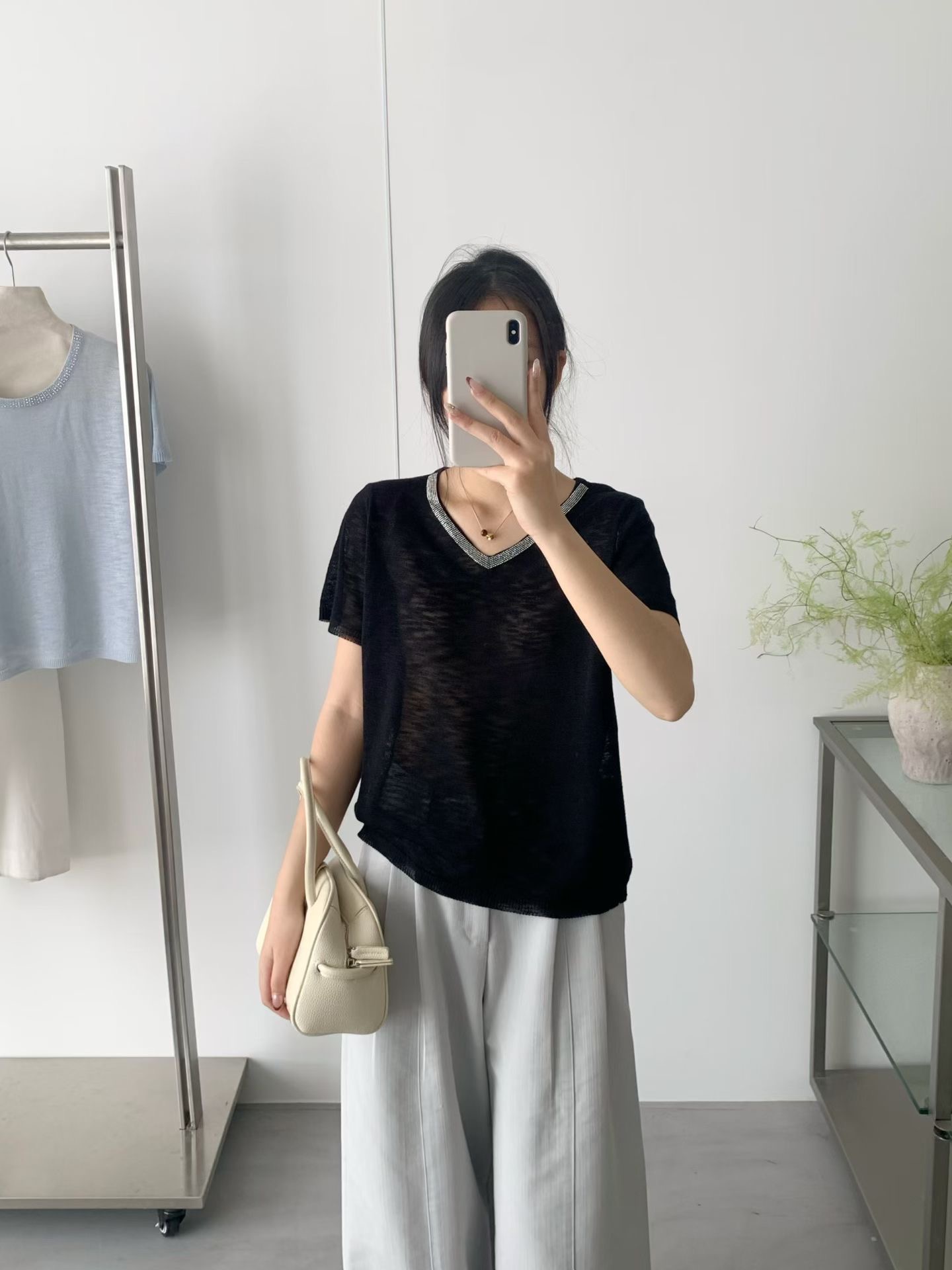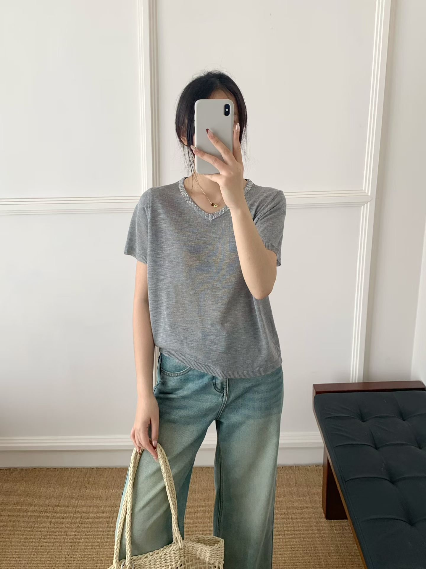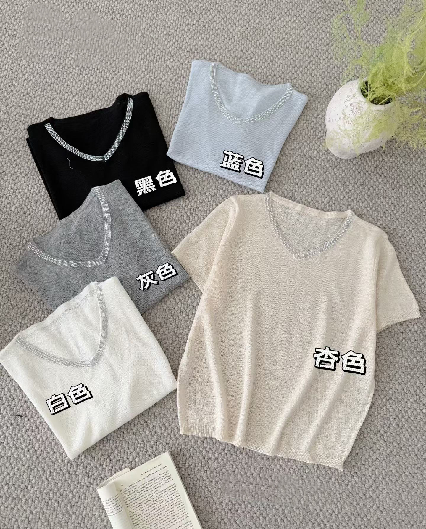 여름 새로운 빛 럭셔리 니트 반팔 티셔츠 여성 루즈핏 인사이드 가져 가라. 낮음 라운드 넥 만나는 얇은 맨위 반소매 다용도 트렌디