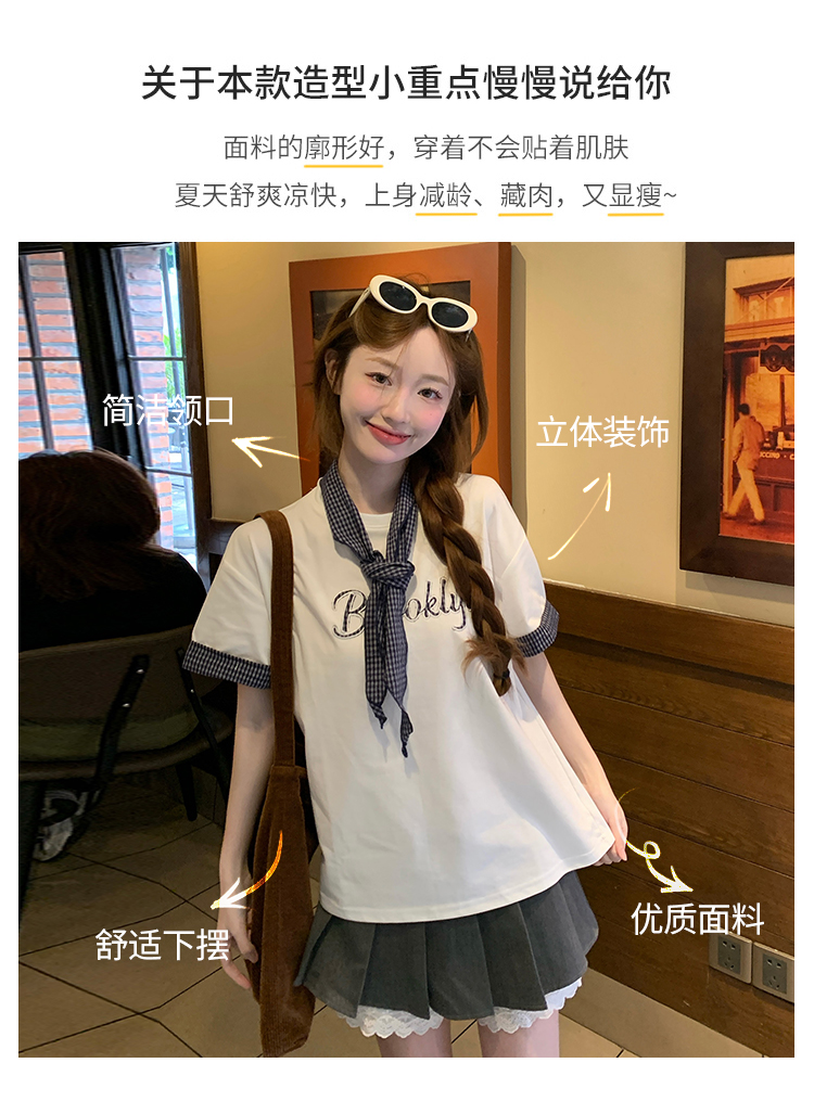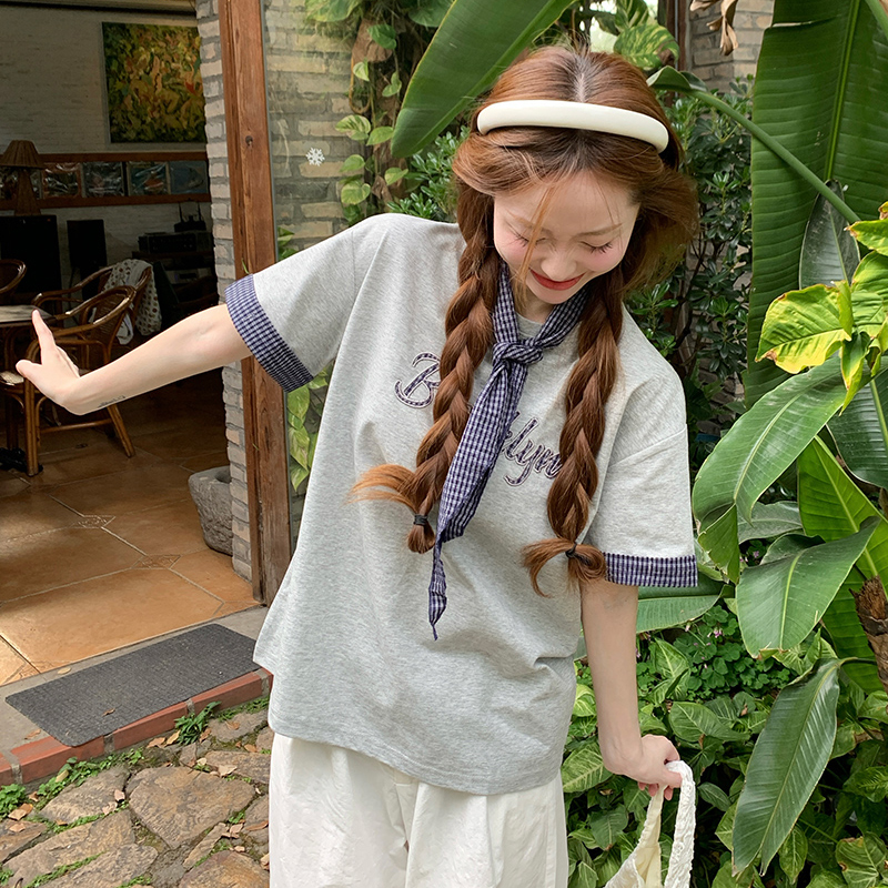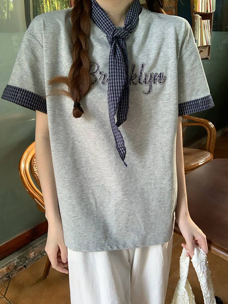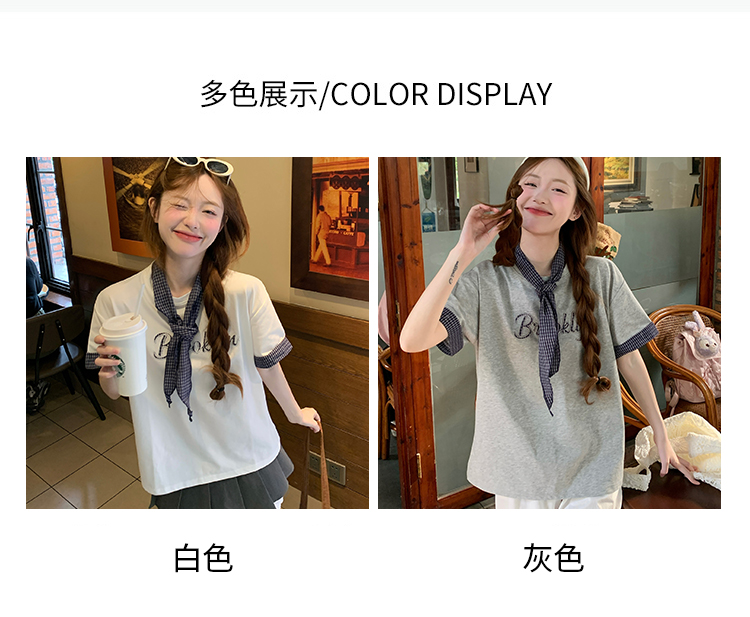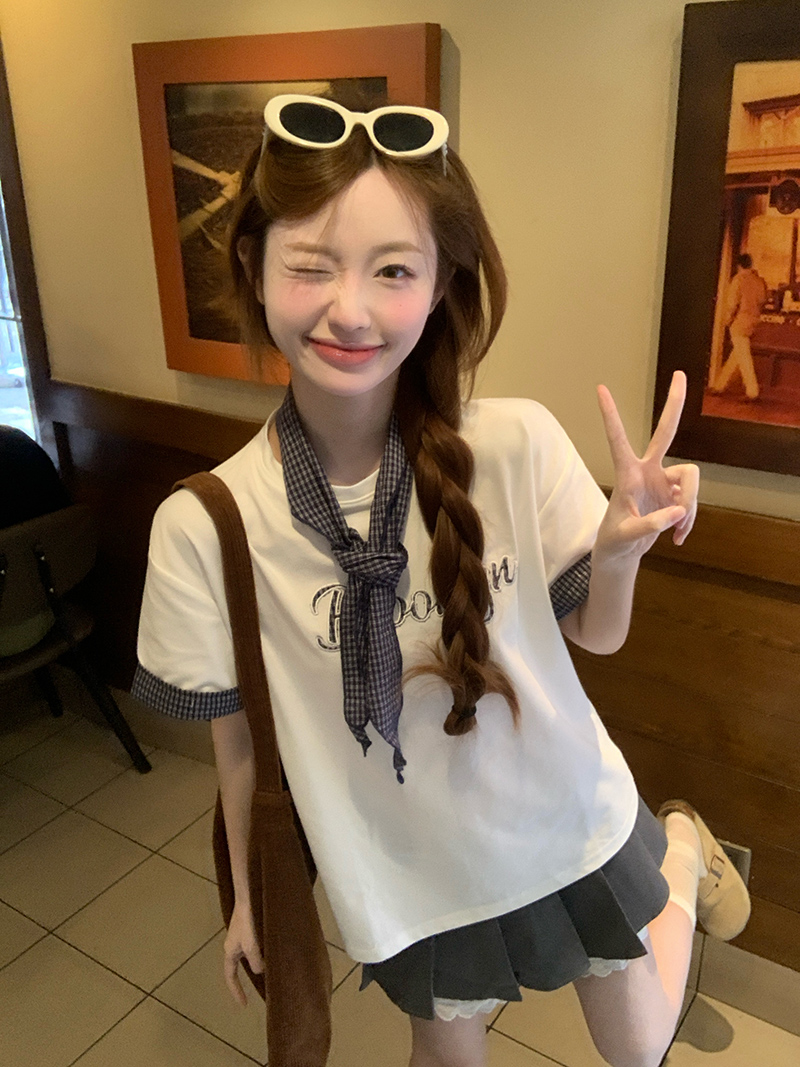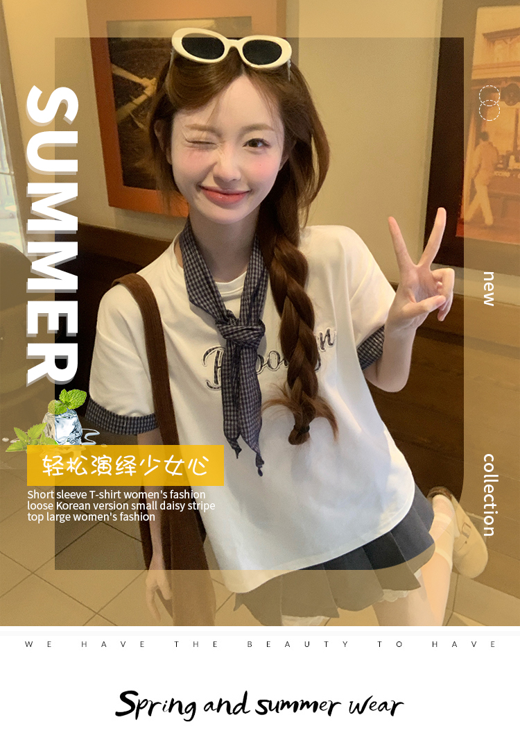 실사 21 순면 반팔 티셔츠 여름 2026 새로운 트렌디 긍정적 인 어깨 체크무늬 패치워크 쇼트 스타일 라운드 넥 맨위 여성 의류