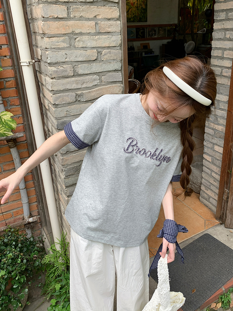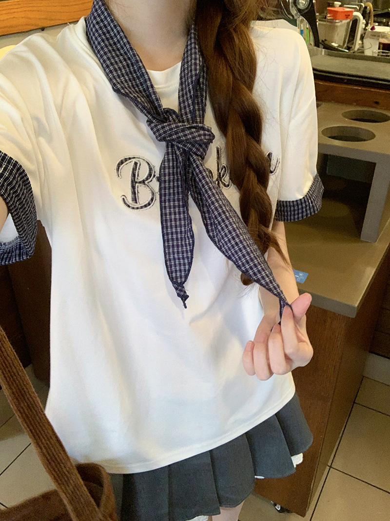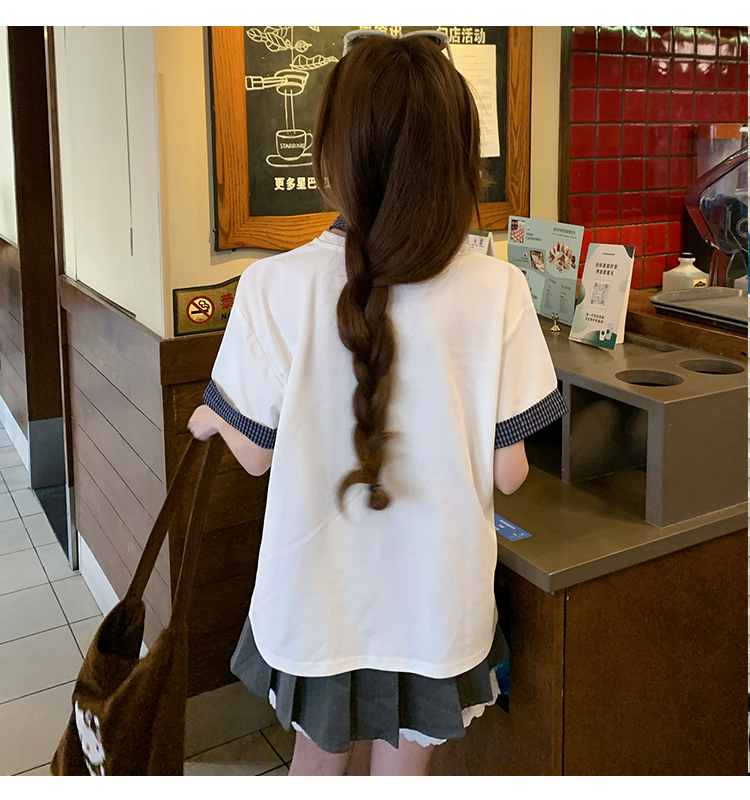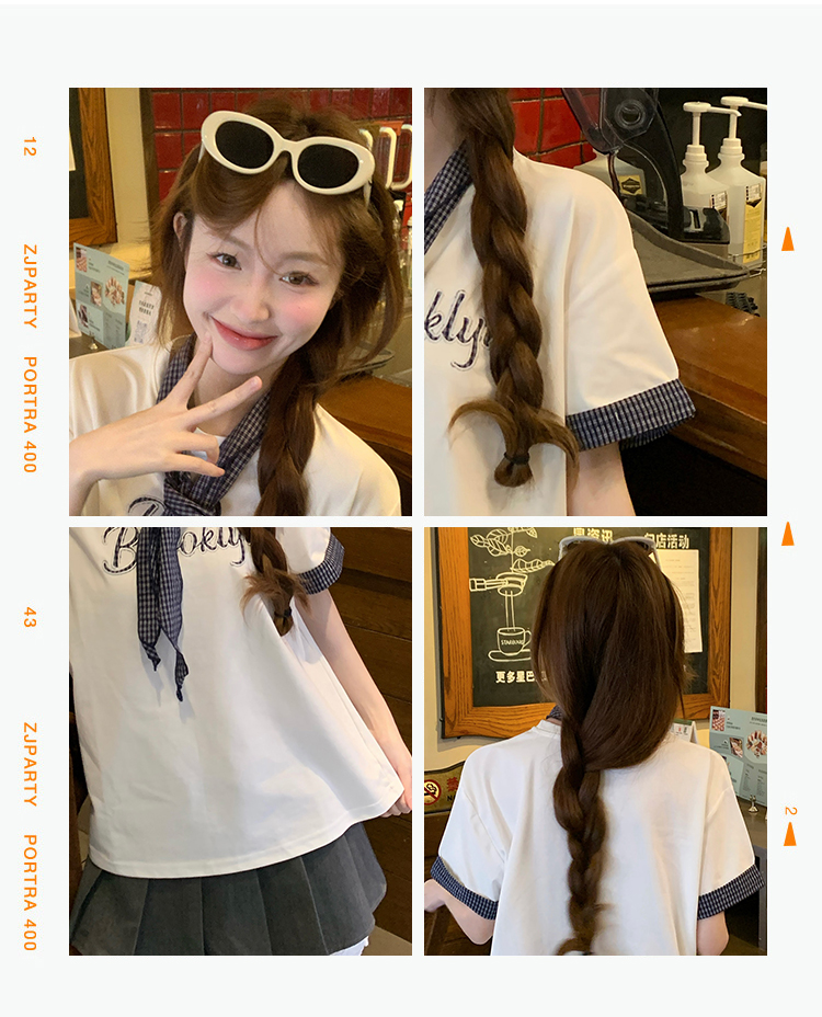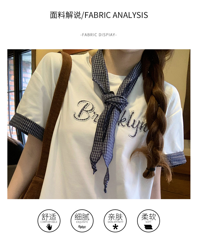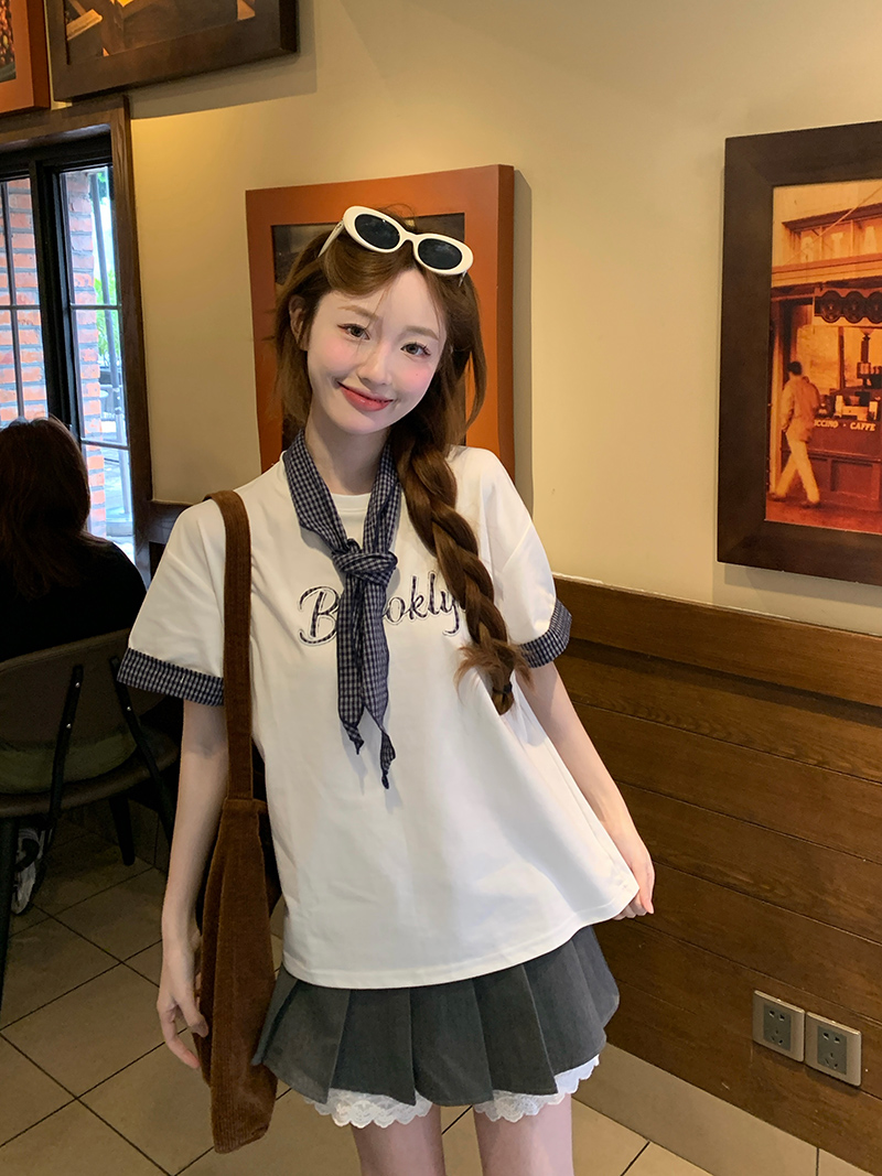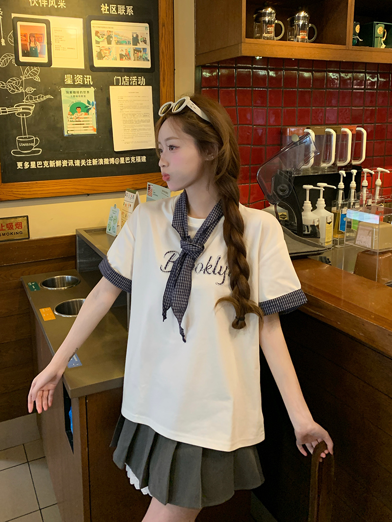 실사 21 순면 반팔 티셔츠 여름 2026 새로운 트렌디 긍정적 인 어깨 체크무늬 패치워크 쇼트 스타일 라운드 넥 맨위 여성 의류