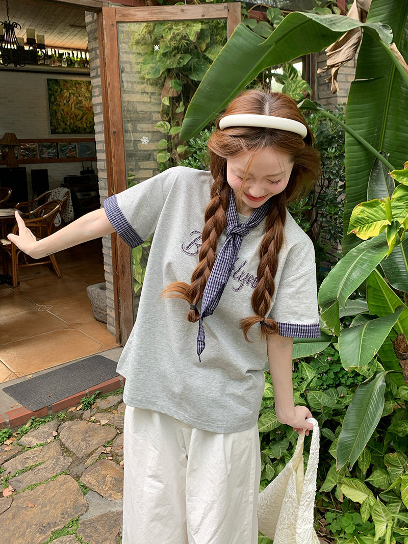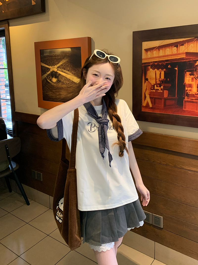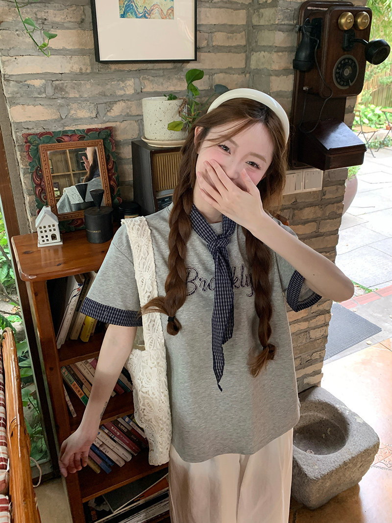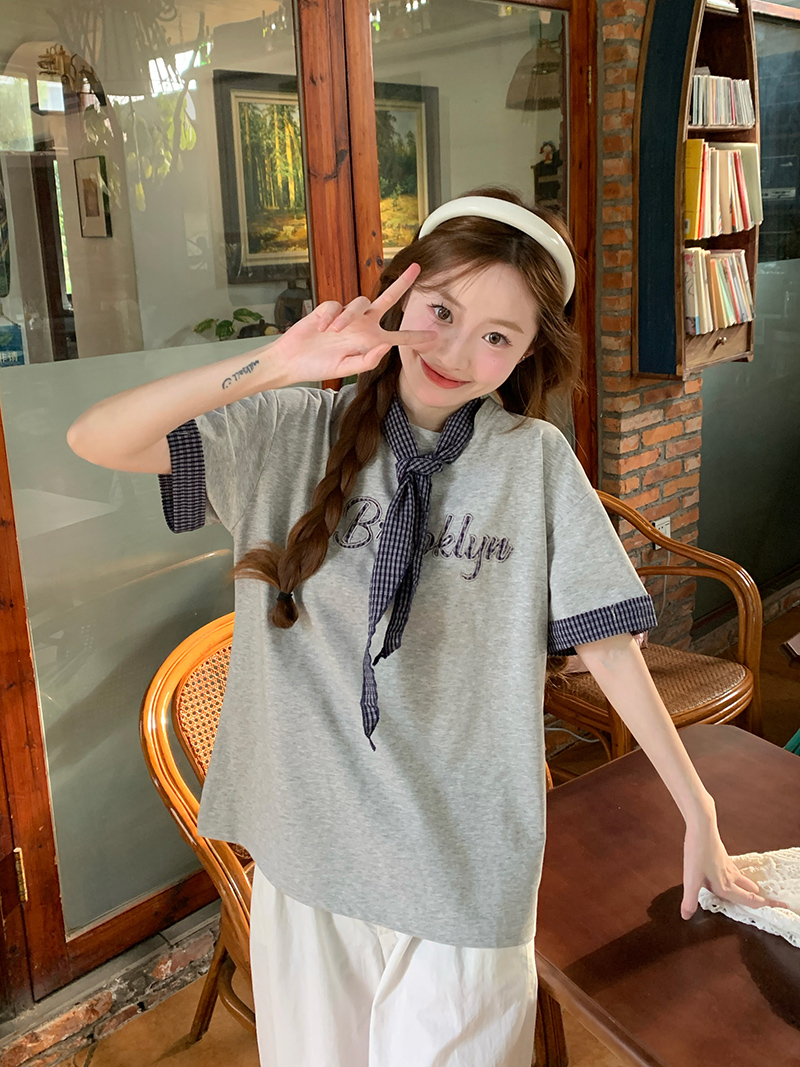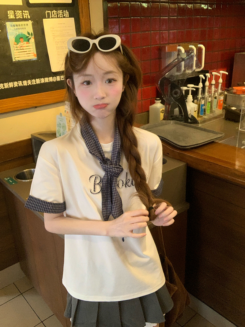 실사 21 순면 반팔 티셔츠 여름 2026 새로운 트렌디 긍정적 인 어깨 체크무늬 패치워크 쇼트 스타일 라운드 넥 맨위 여성 의류