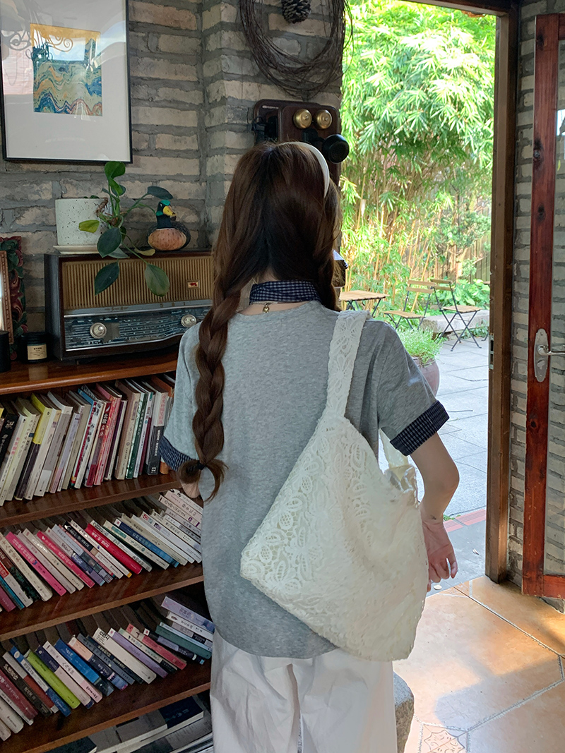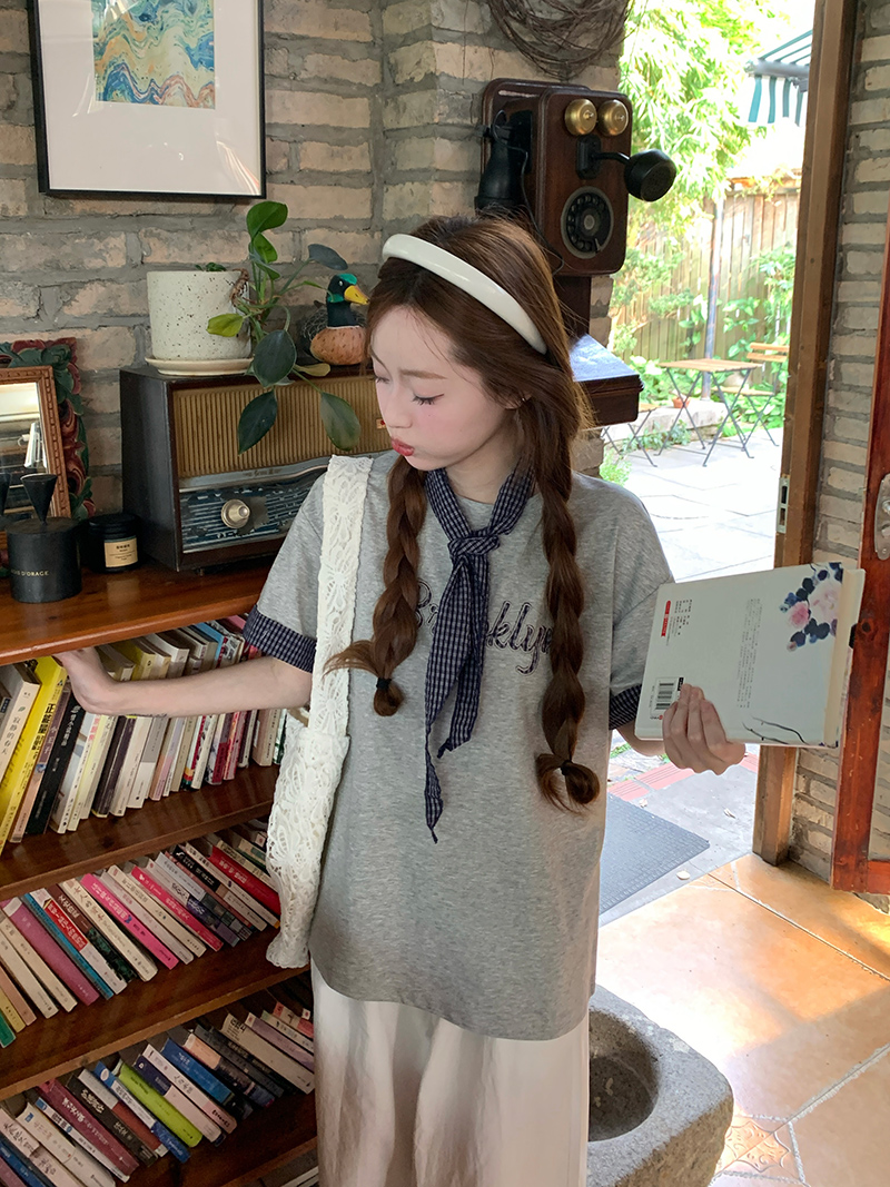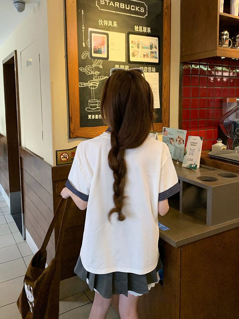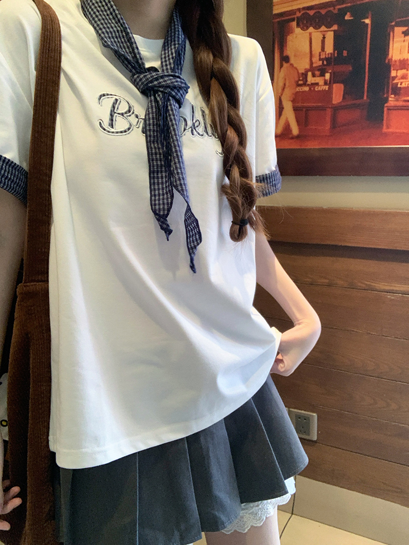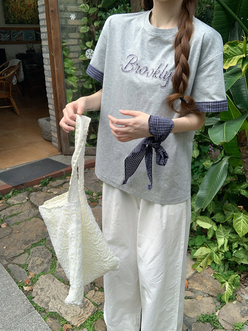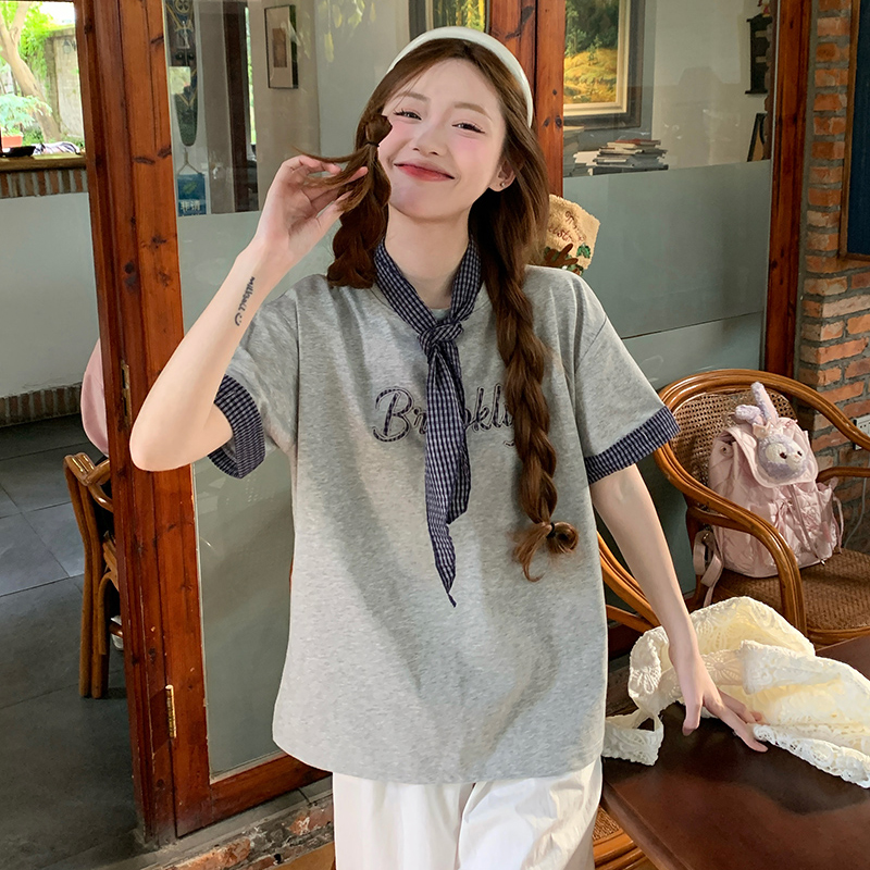 실사 21 순면 반팔 티셔츠 여름 2026 새로운 트렌디 긍정적 인 어깨 체크무늬 패치워크 쇼트 스타일 라운드 넥 맨위 여성 의류