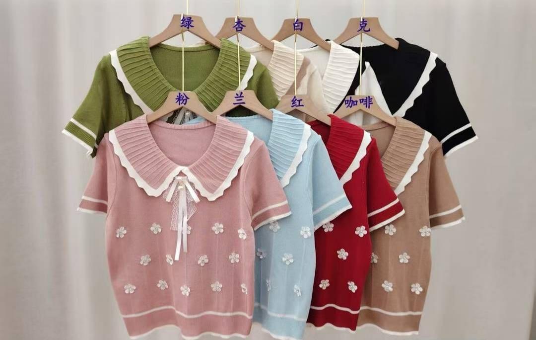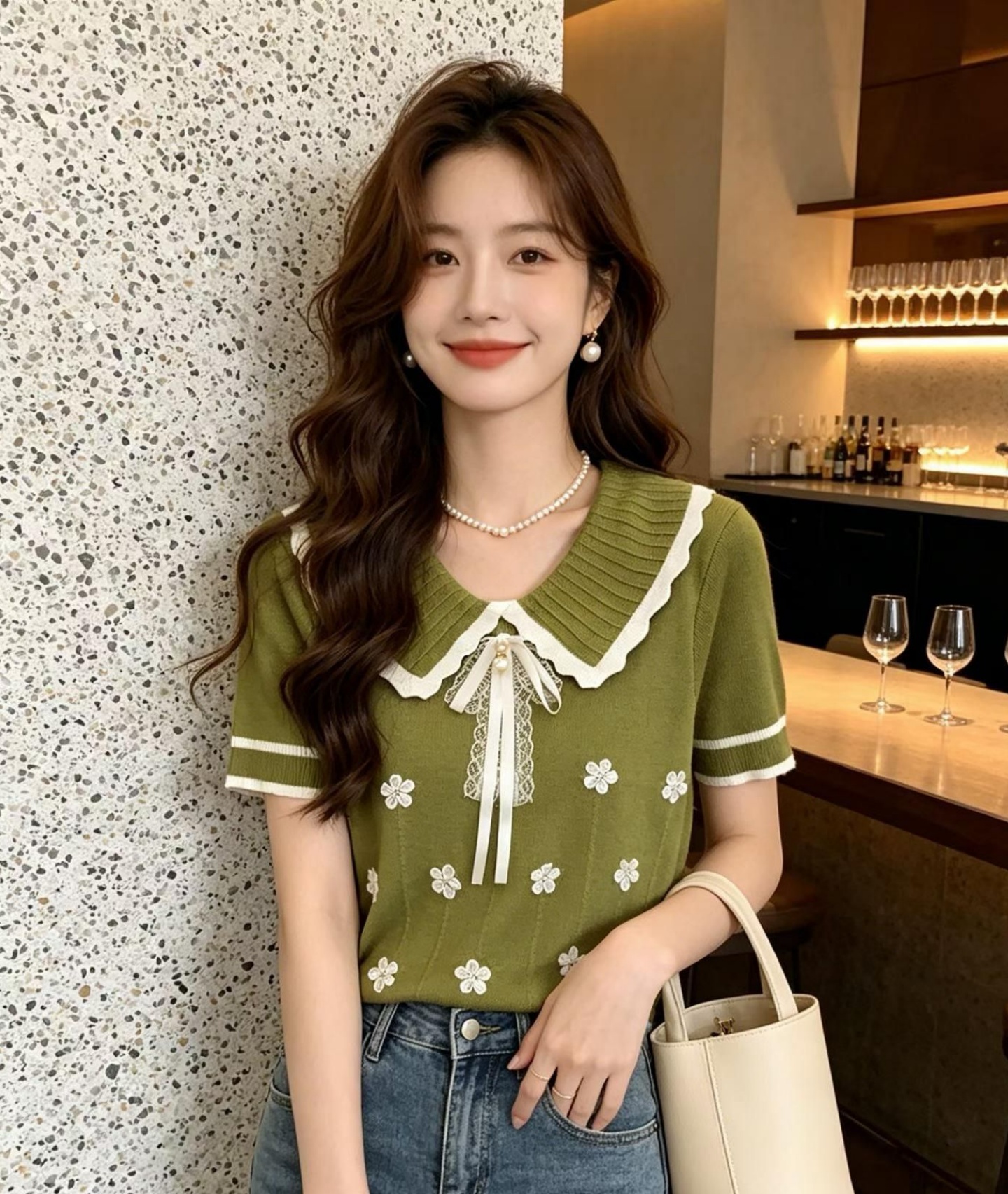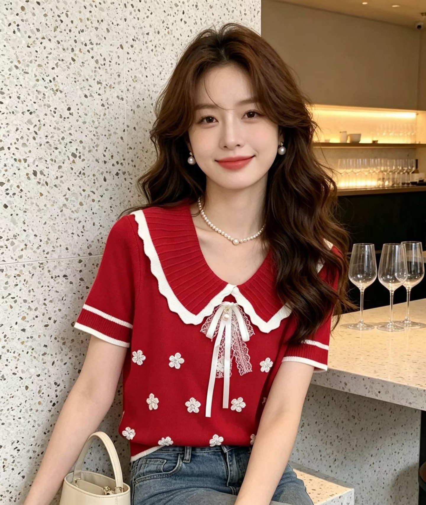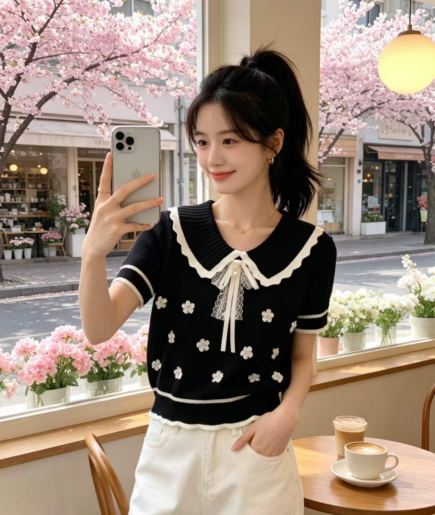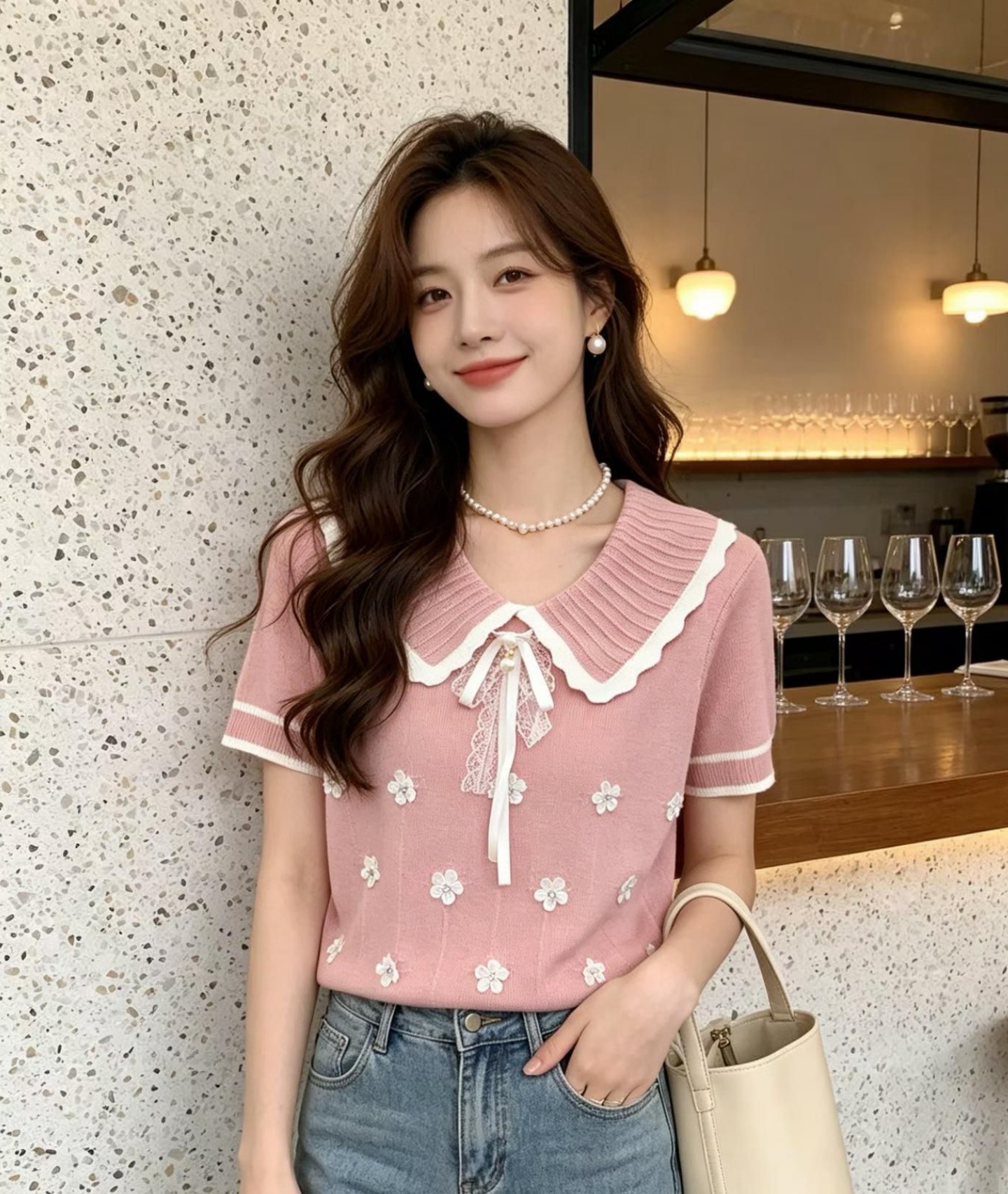 2026 년 여름 새로운 디자인 센스 달콤함 작은 샤넬 스타일 베이비 칼라 나비 매듭 3 차원 꽃 비즈 박기 니트 반팔