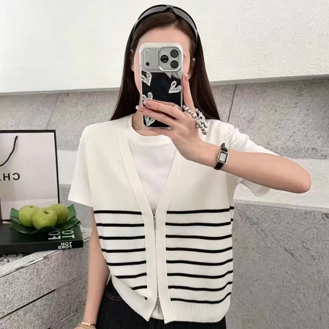 2026 년 여름 새로운 디자인 센스 학원 스타일 V넥 배색 스트라이프 바늘 스택 착용 더블 머리 지퍼 조끼 오픈 가디건
