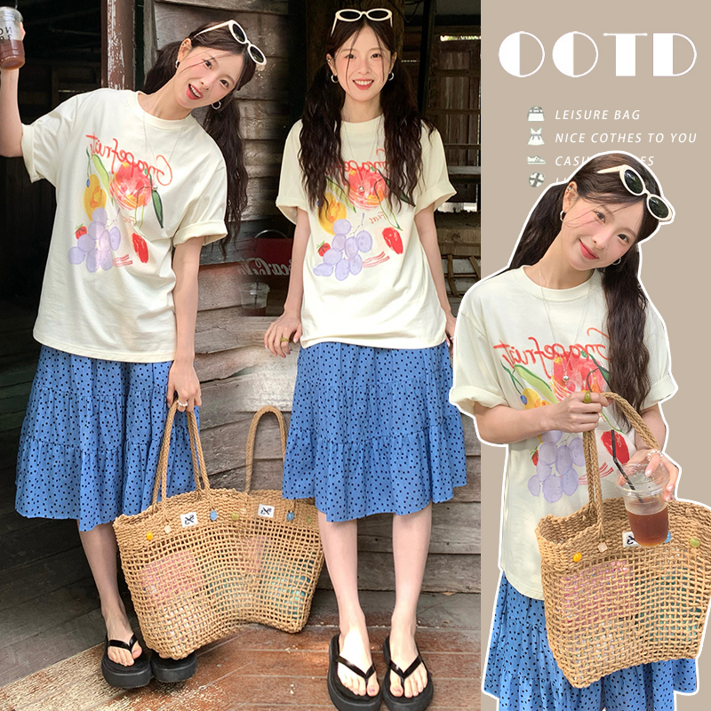 한국 스타일 루즈핏 여름 다채로운 티셔츠 파란색 도트 무늬 반신 스커트 임신 엄마 편안함 세트