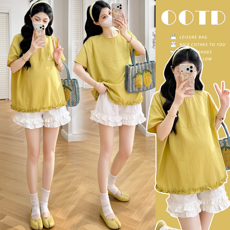 실사 여름 한국 스타일 루즈핏 디스플레이 화이트 레이스 맨위 프릴 반바지 임신 엄마 캐주얼 차가운 세트