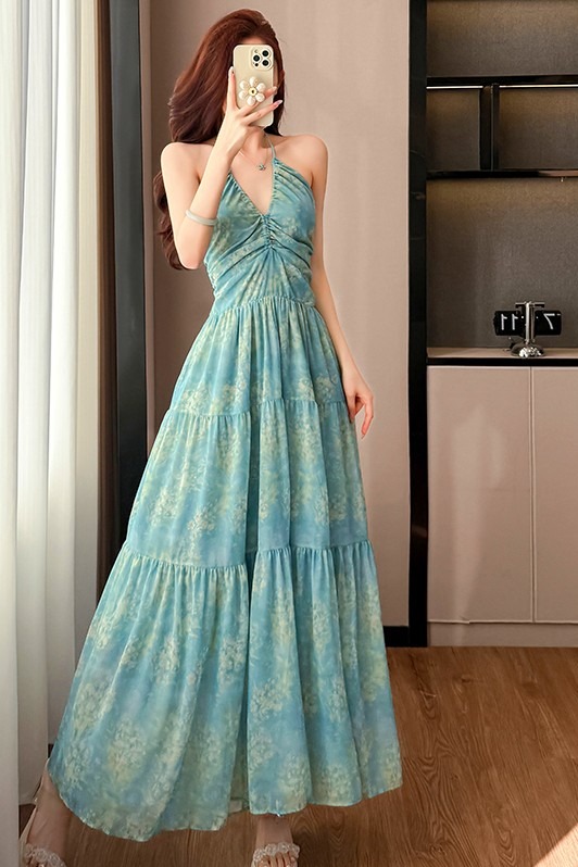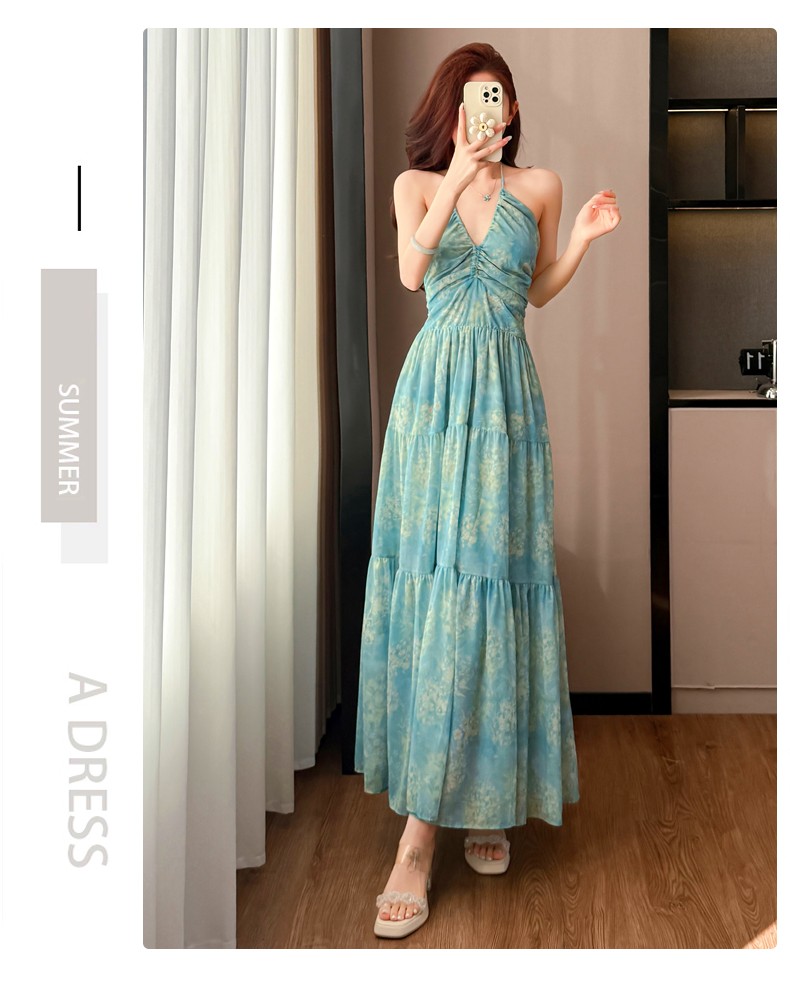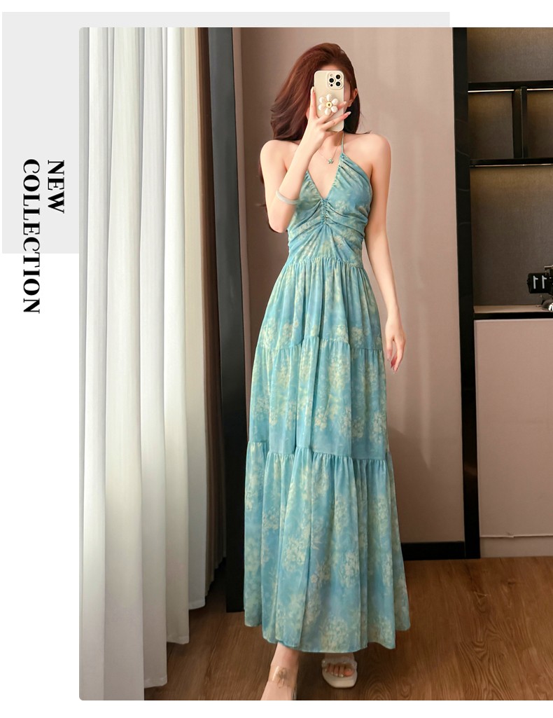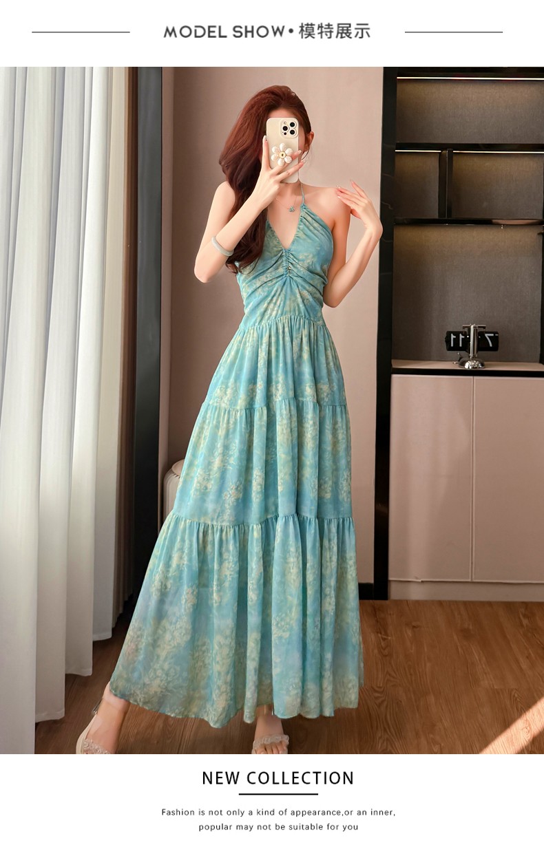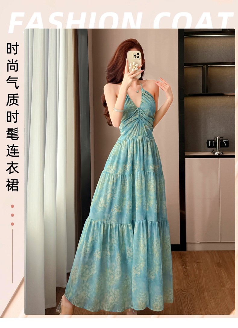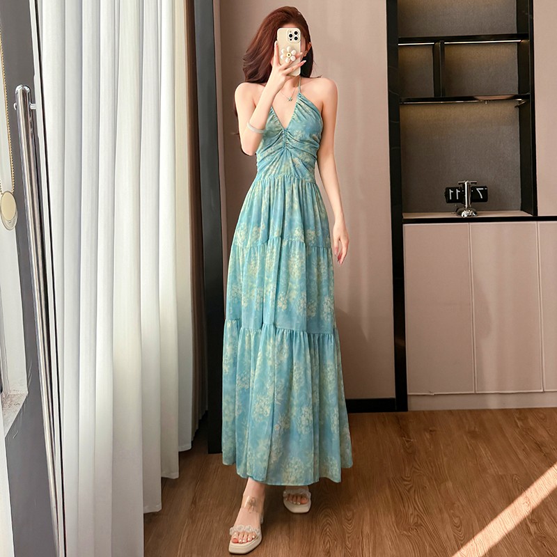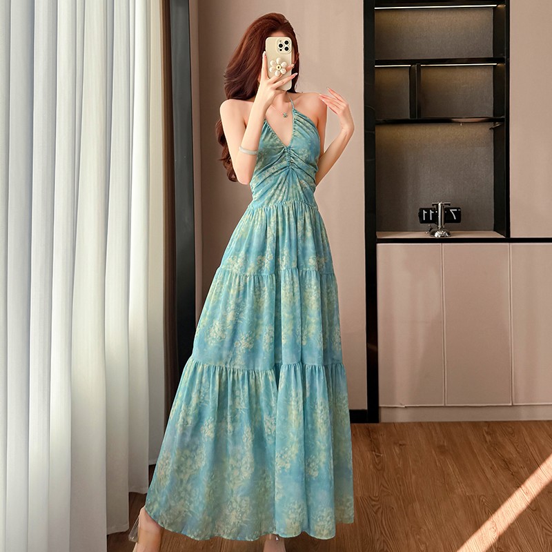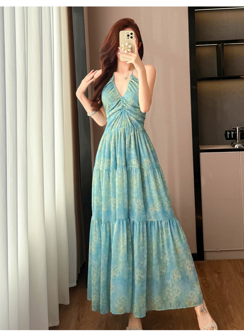 V넥 슬립 여성 드레스 여름 2026 새로운 쉬폰 파란색 그라데이션 휴가 바람 해변가 해변 치마