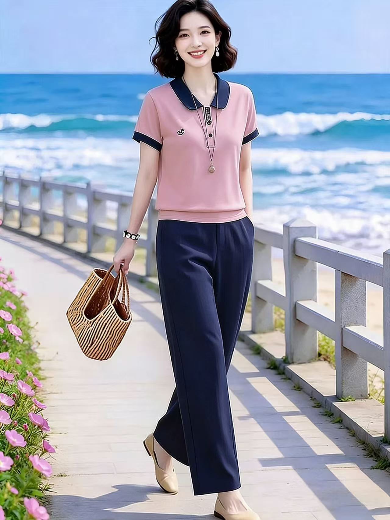 다용도 폴로 칼라 배색 맨위 허리밴드 스트레이트 팬츠 세트 여름