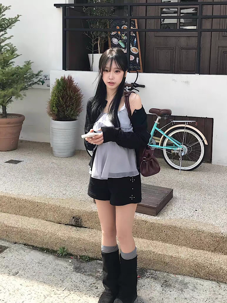 있음 선적 한국 ins 귀여운 ~ 중 반팔 Pleat 측면 니트 스웨터