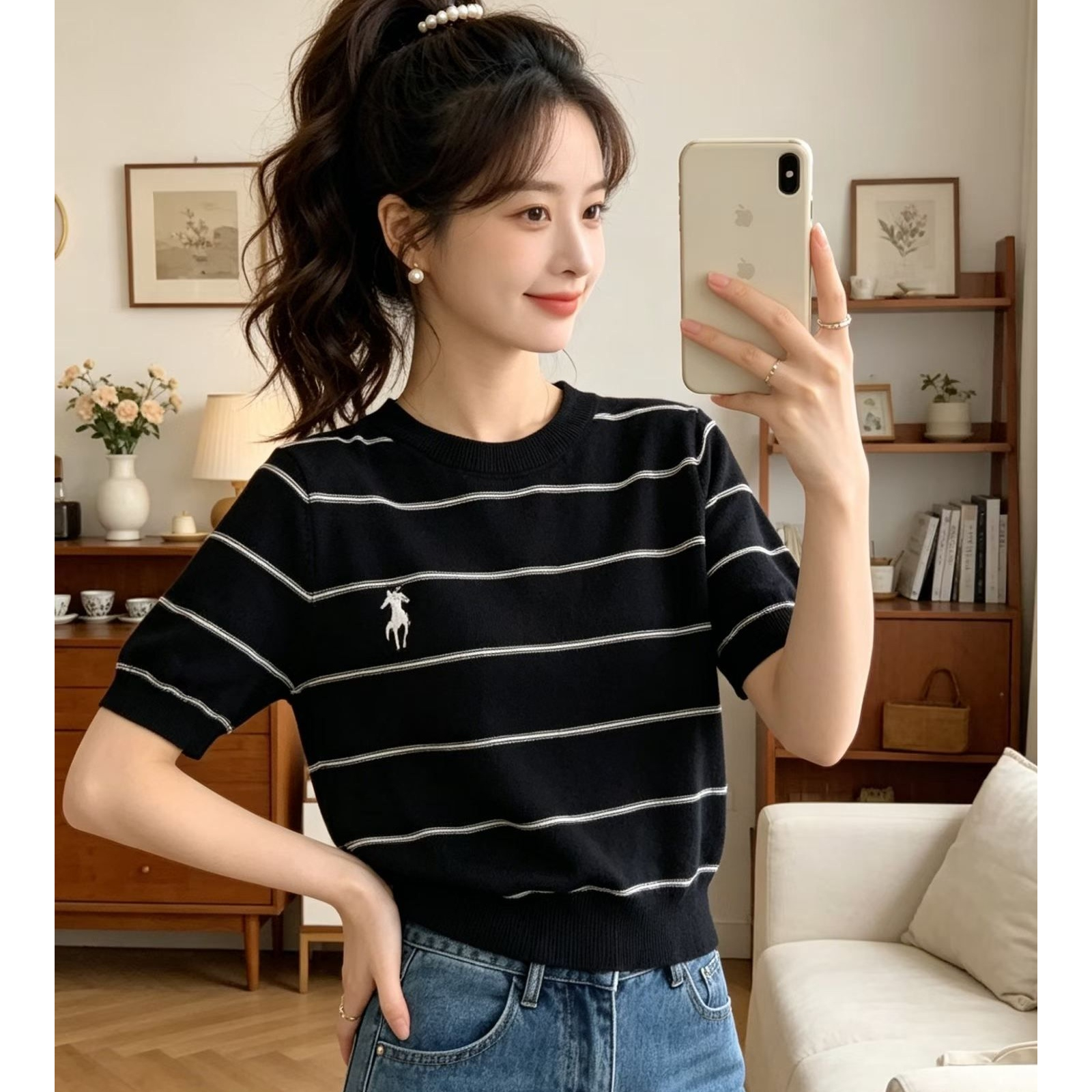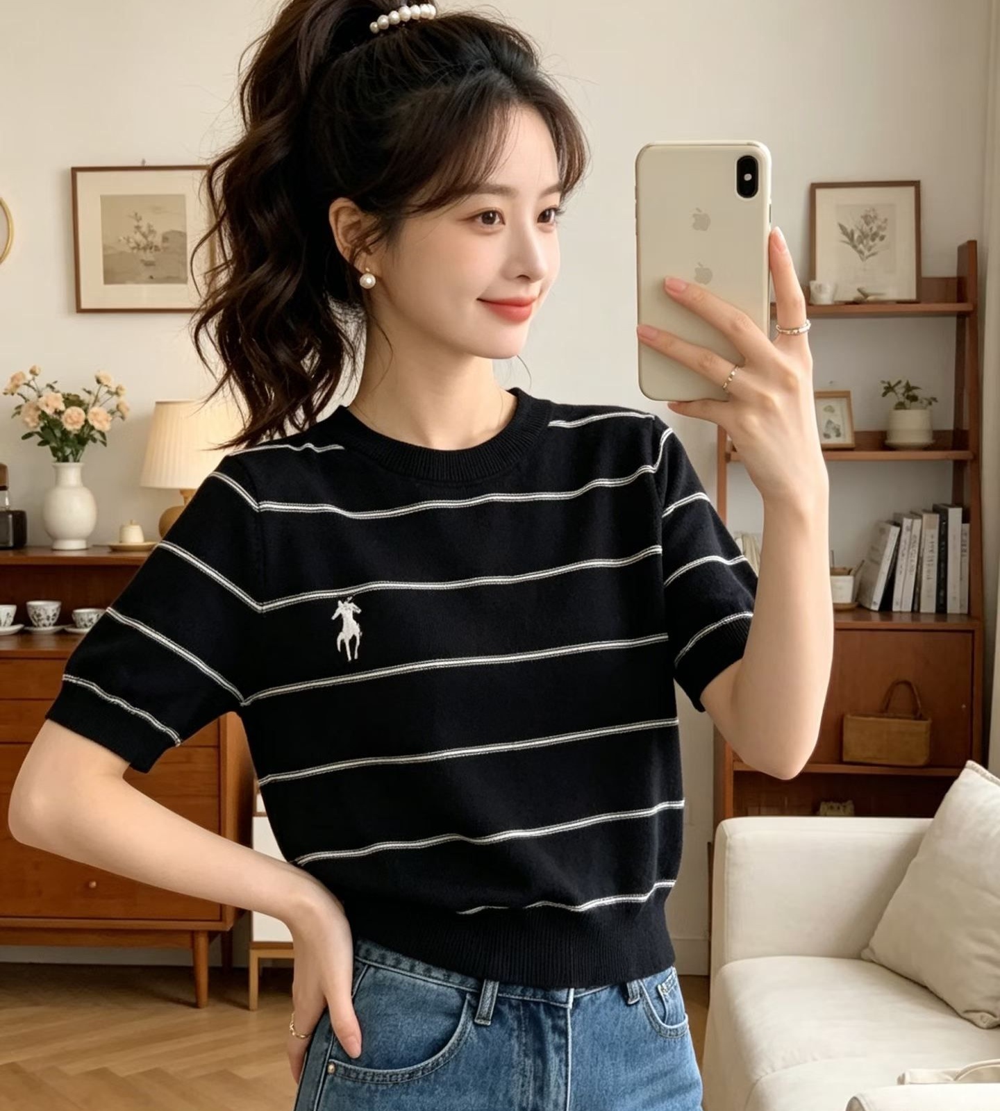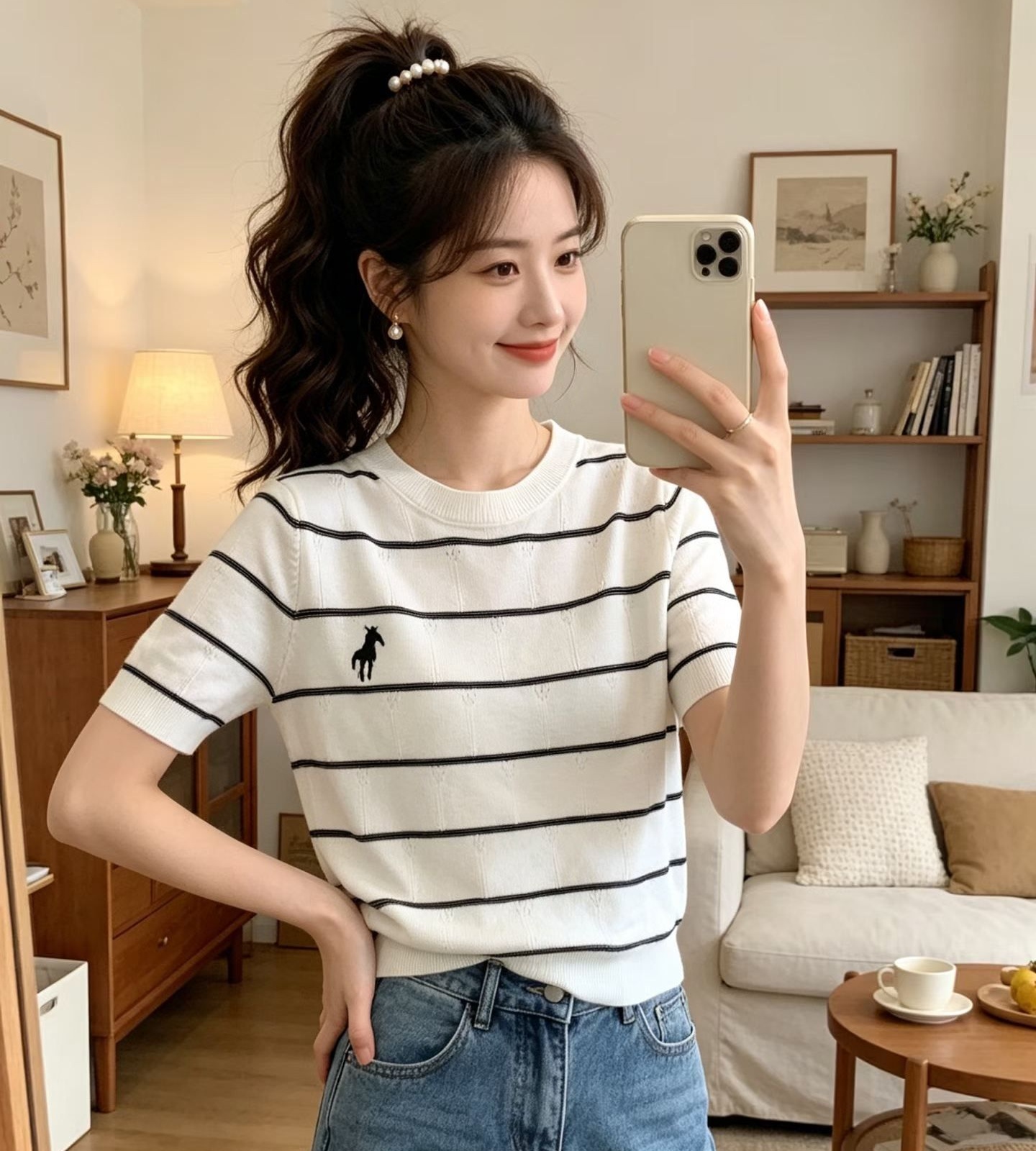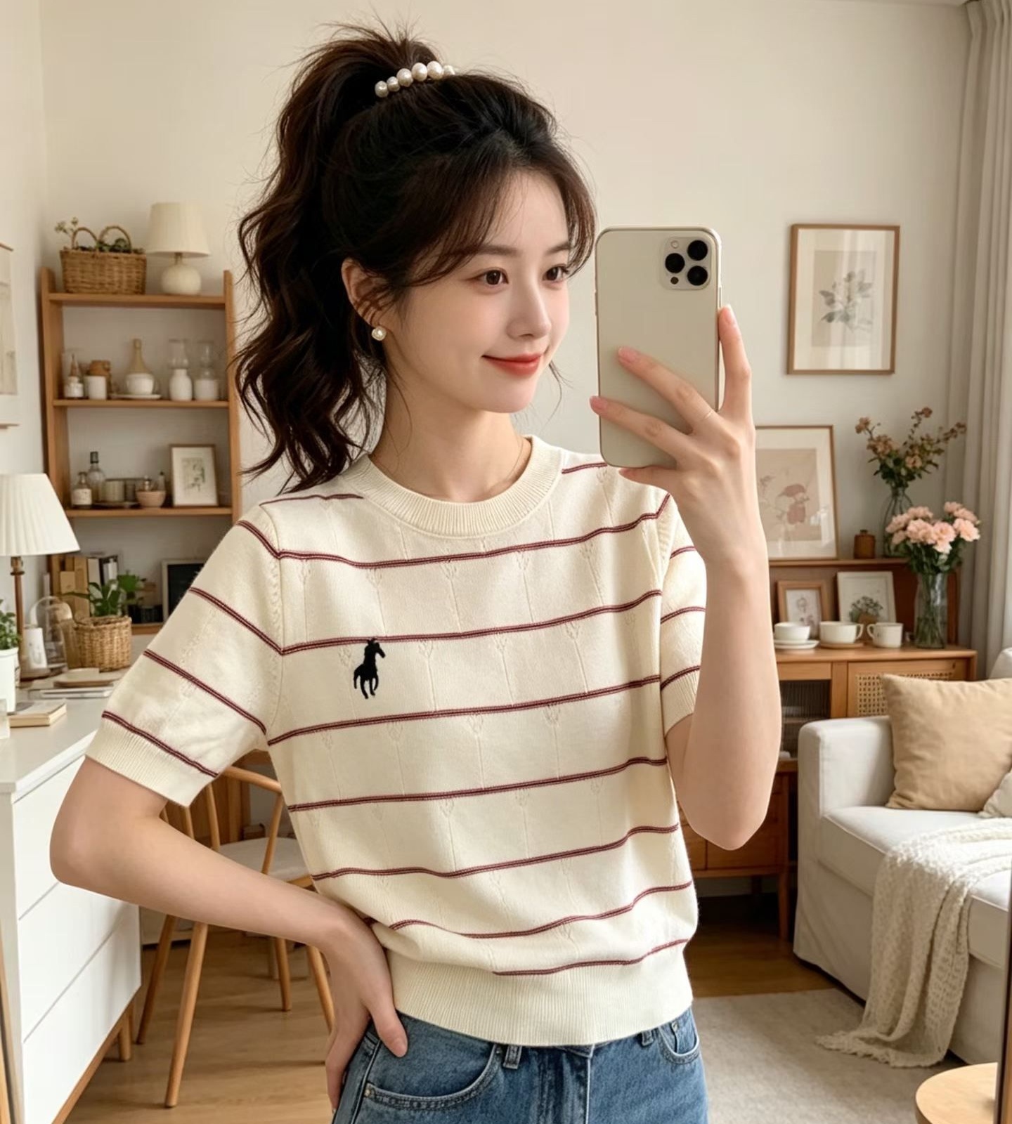 2026 년 여름 새로운 디자인 센스 한국 스타일 패션 라운드 넥 자수 배색 스트라이프 부드러운 찹쌀 홀로우 아웃 풀오버 반팔
