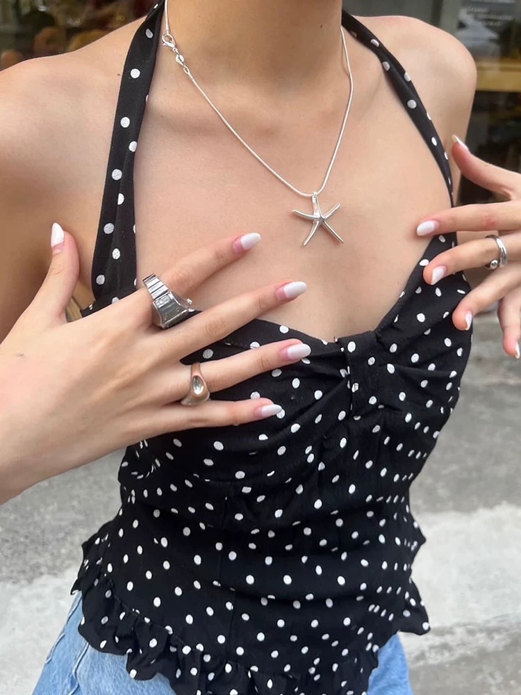 여름 불규칙 작은 대중 아니요 명중 섹션 도트 무늬 섹시함 V넥 반팔 티셔츠 여성 아름다운 몸매 가꾸기 슬림해 보이는 쇼트 스타일 맨위