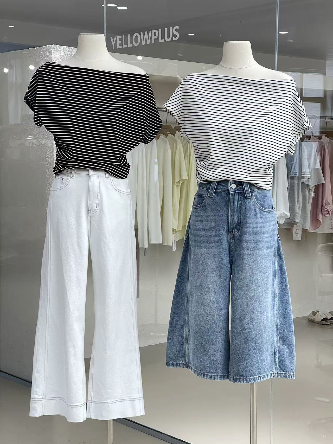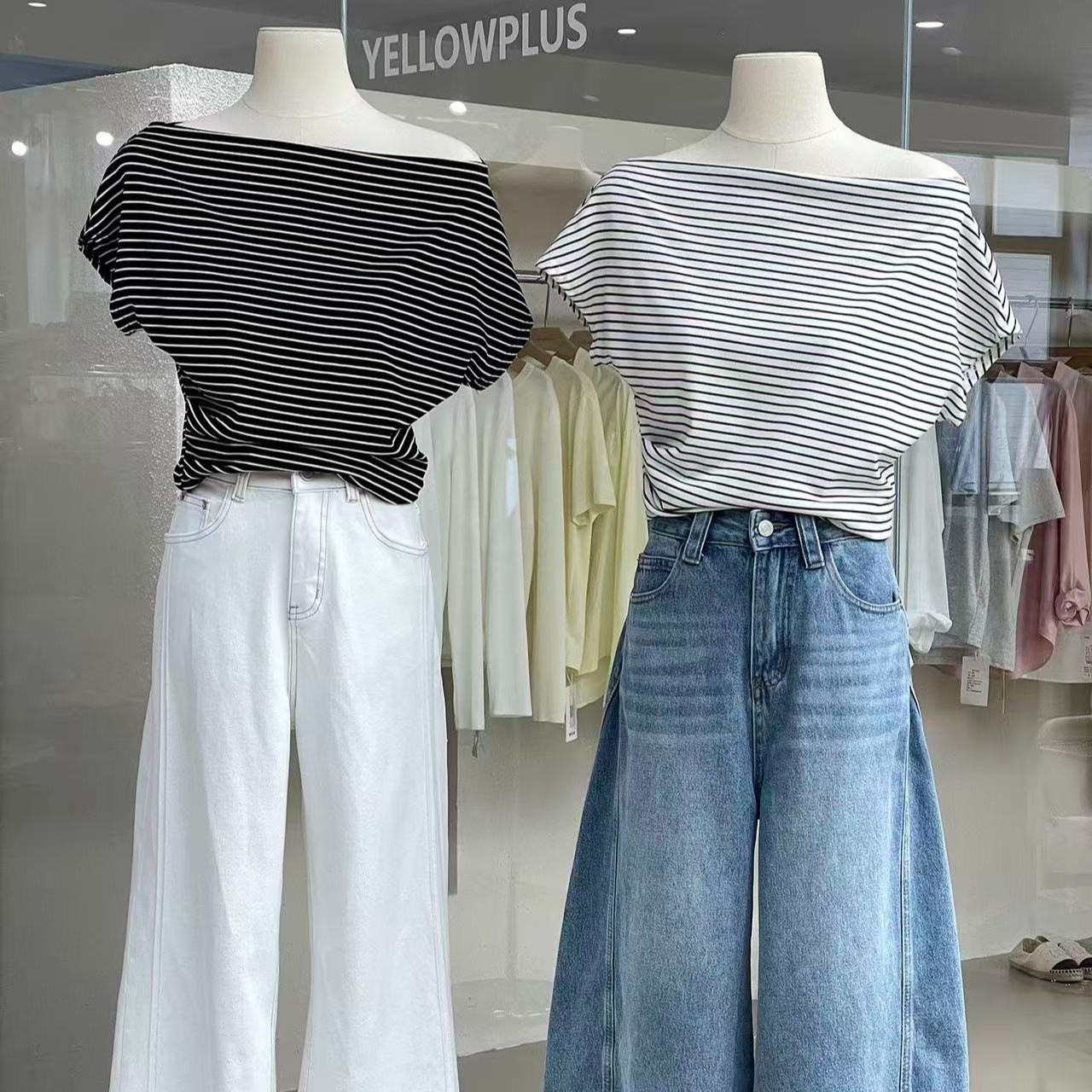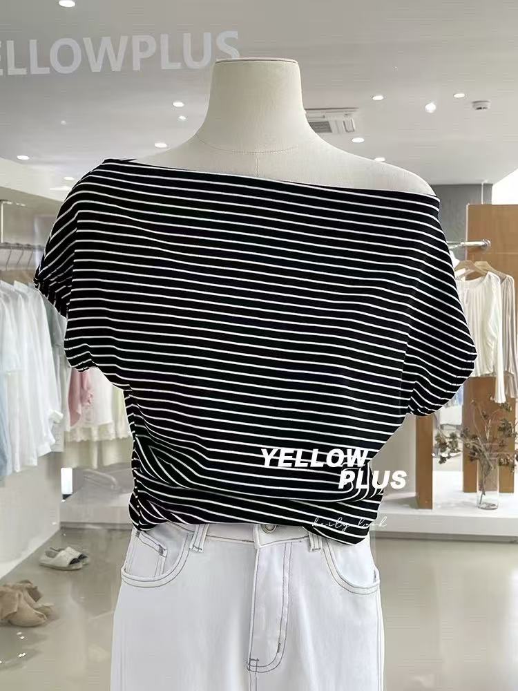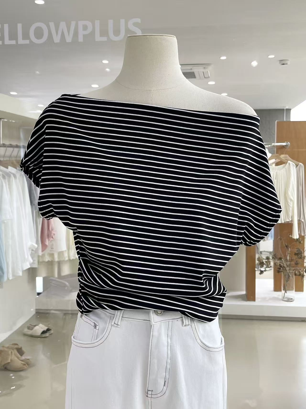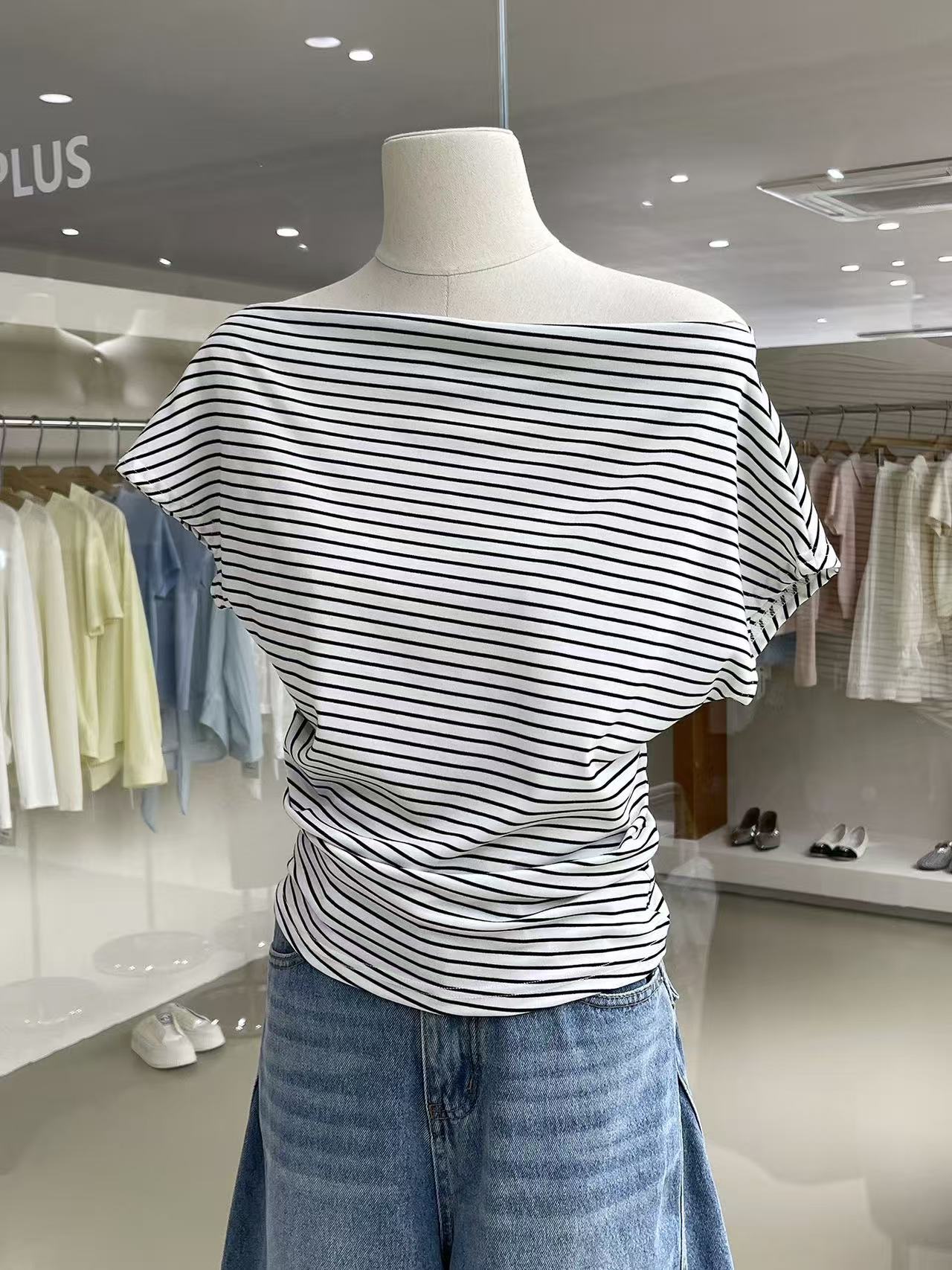 품격 슬림해 보이는 클래식 스트라이프 오프숄더 비스듬한 어깨 박쥐 반팔 티셔츠 2026 봄 여름 새로운 외국 가스 작은 맨위