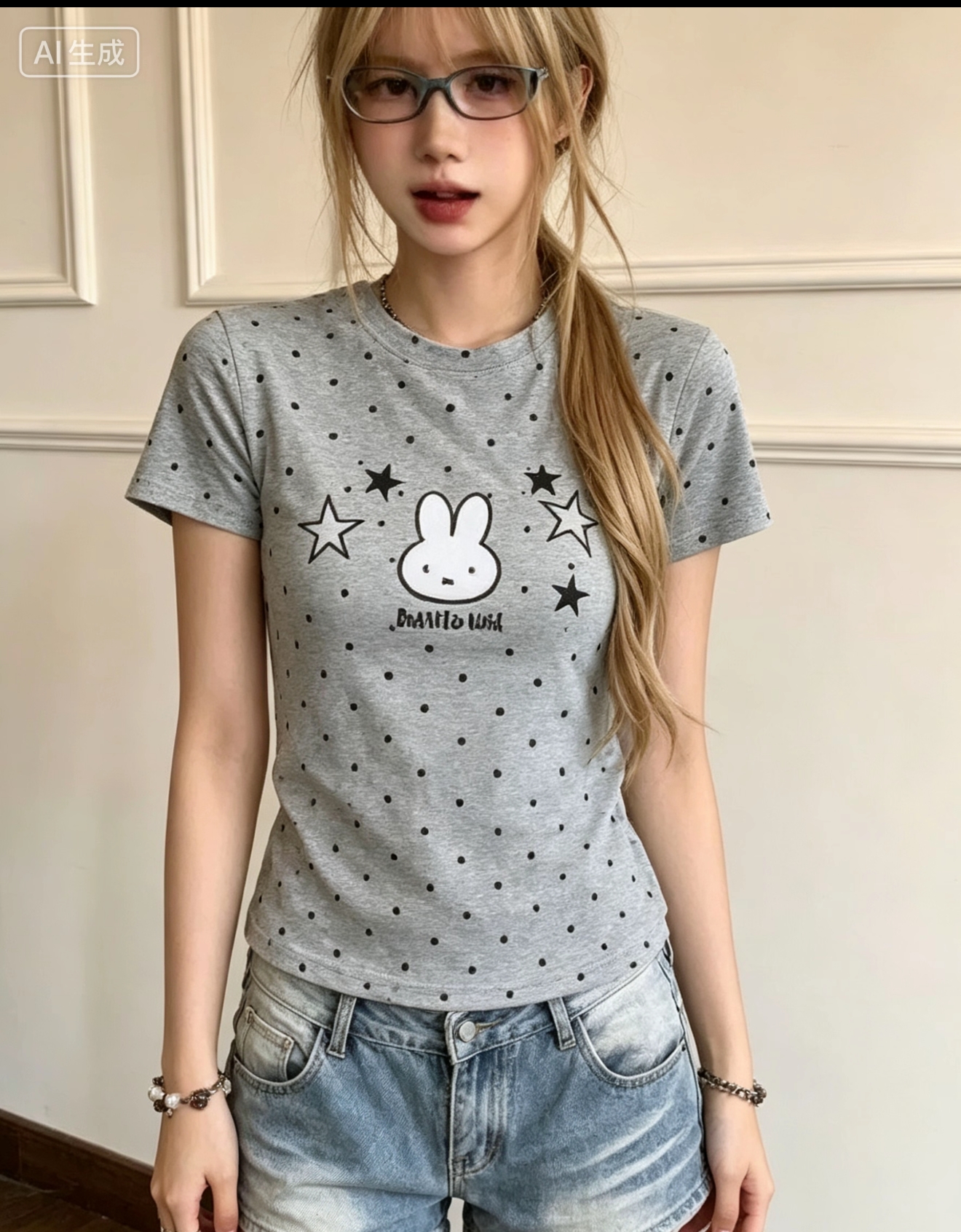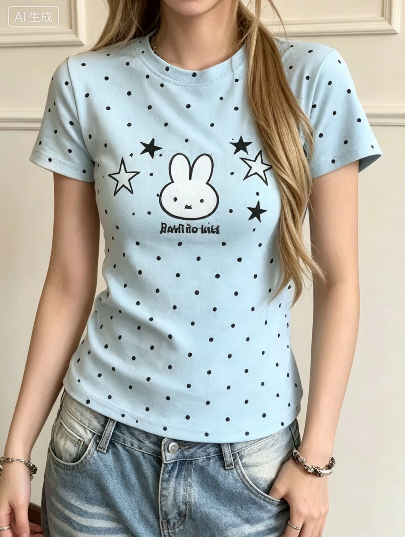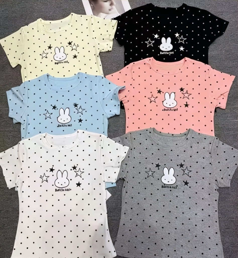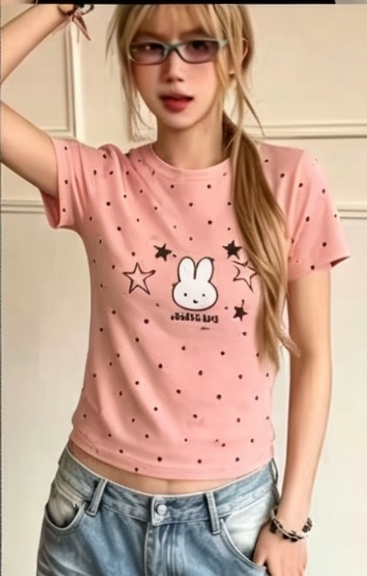 도트 무늬 토끼 자수 반팔 티셔츠 여성 여름 2026 새로운 긍정적 인 어깨 몸매 가꾸기 디스플레이 쇼트 스타일 한 부서 아름다운 맨위