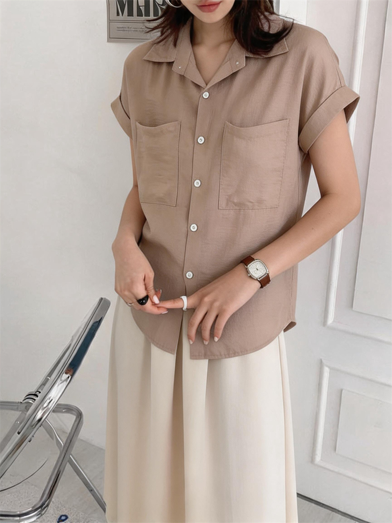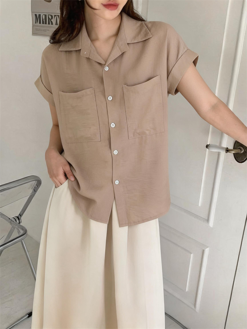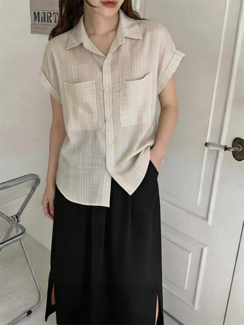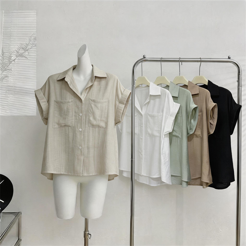 실사 단색 미니멀리즘 주름 캐주얼 출퇴근 반팔 여성 셔츠 새로운 작은 대중 표지 고기 슬림해 보이는 몸매 가꾸기 맨위