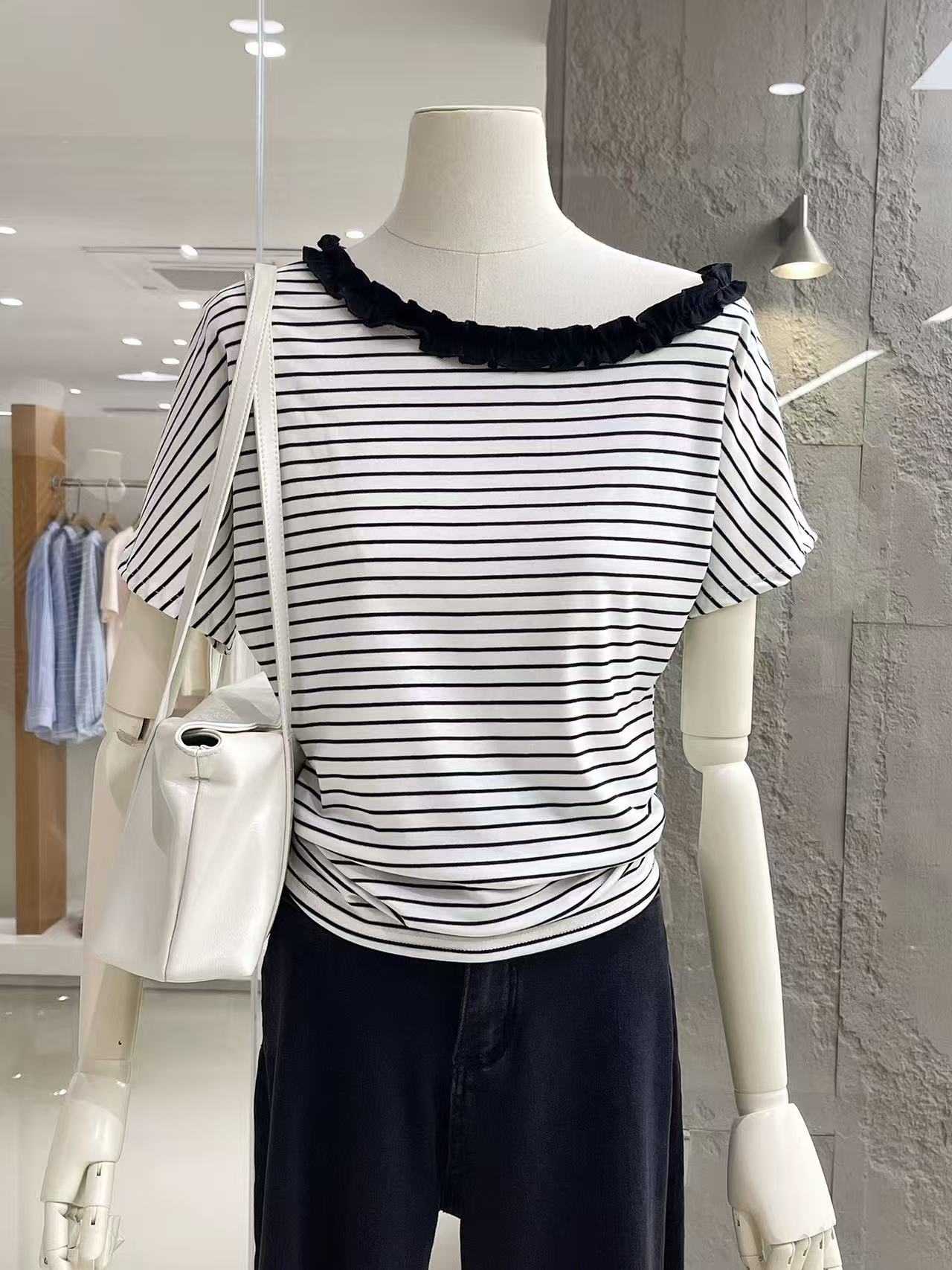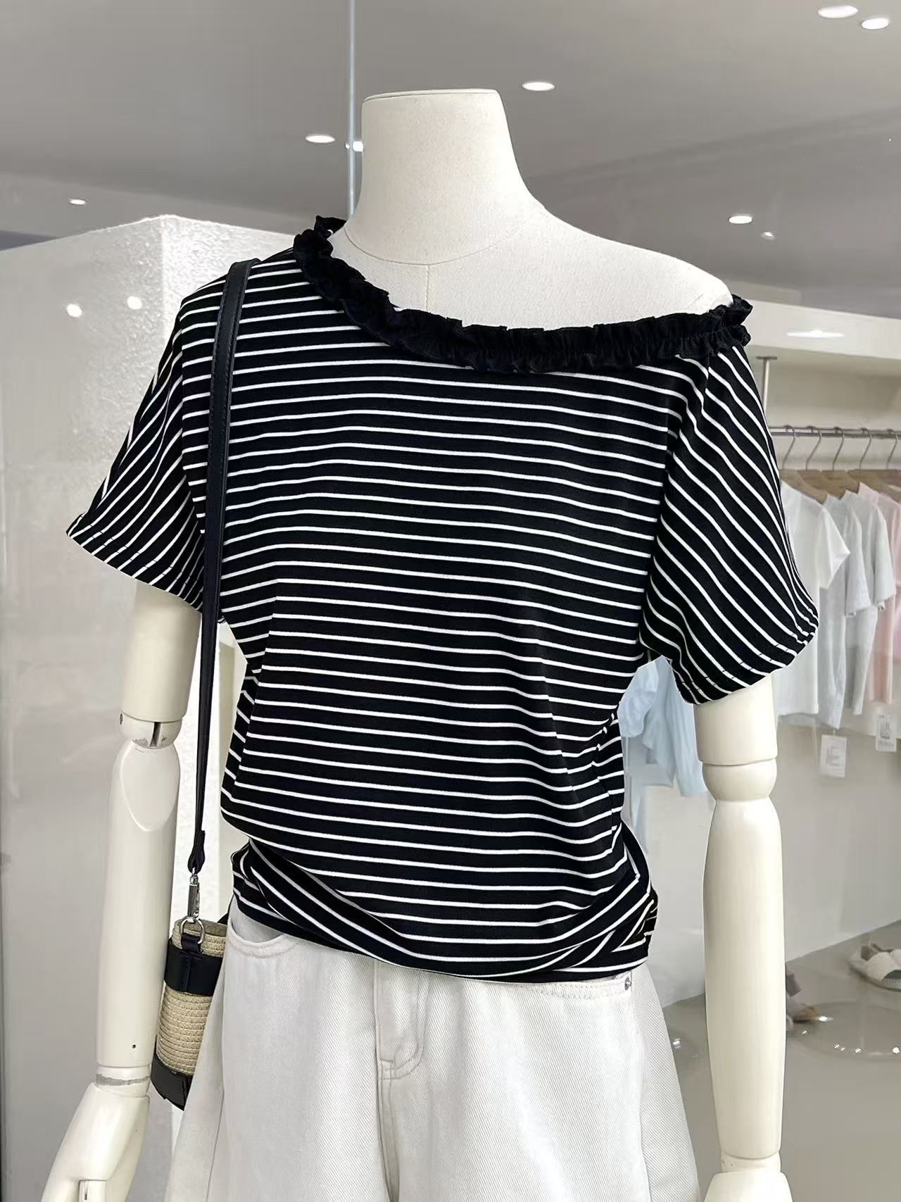 흑백 줄무늬 프릴 비스듬한 어깨 반팔 티셔츠 여성 2026 여름 배트윙 소매 오프숄더 고급 센스 주름 맨위