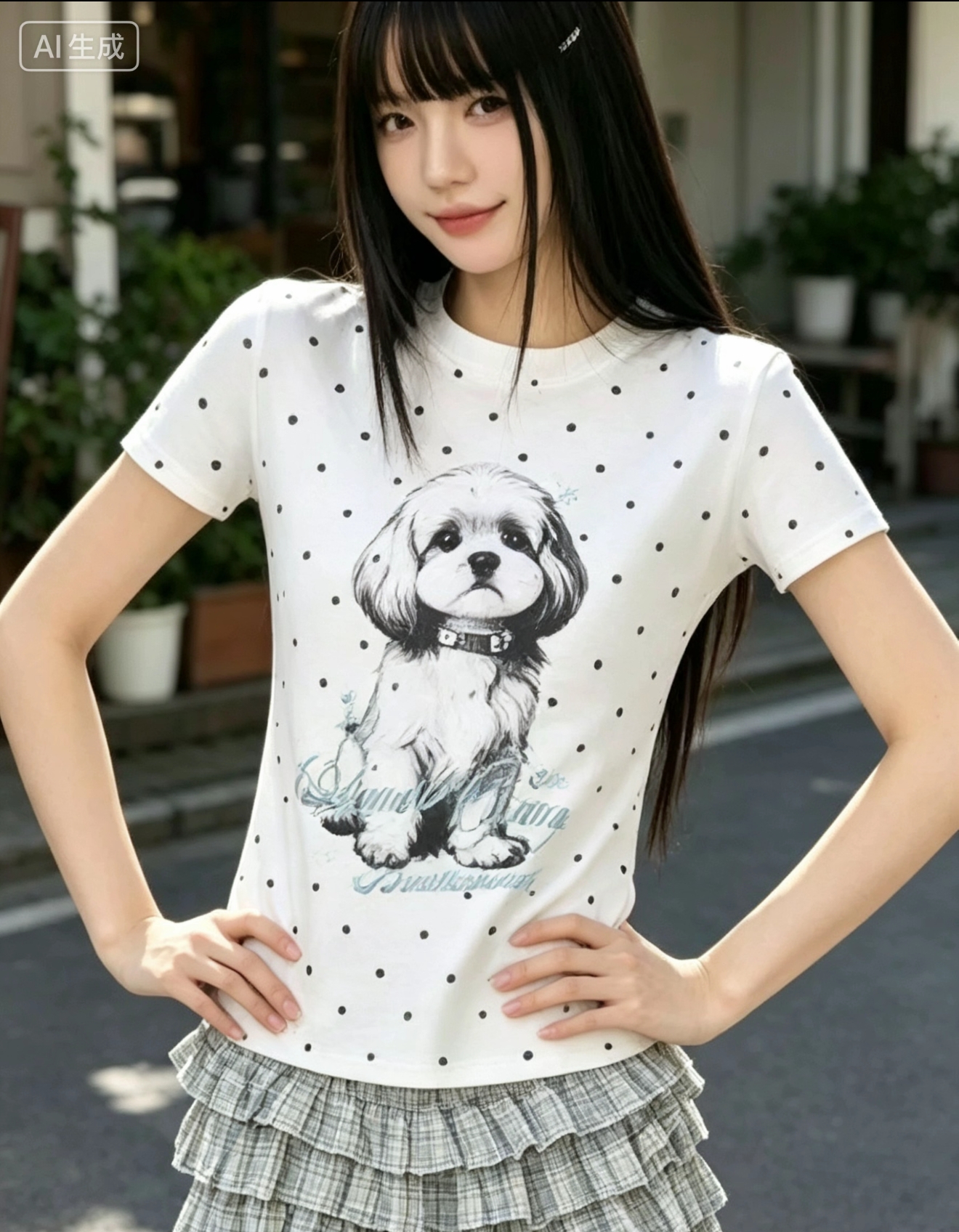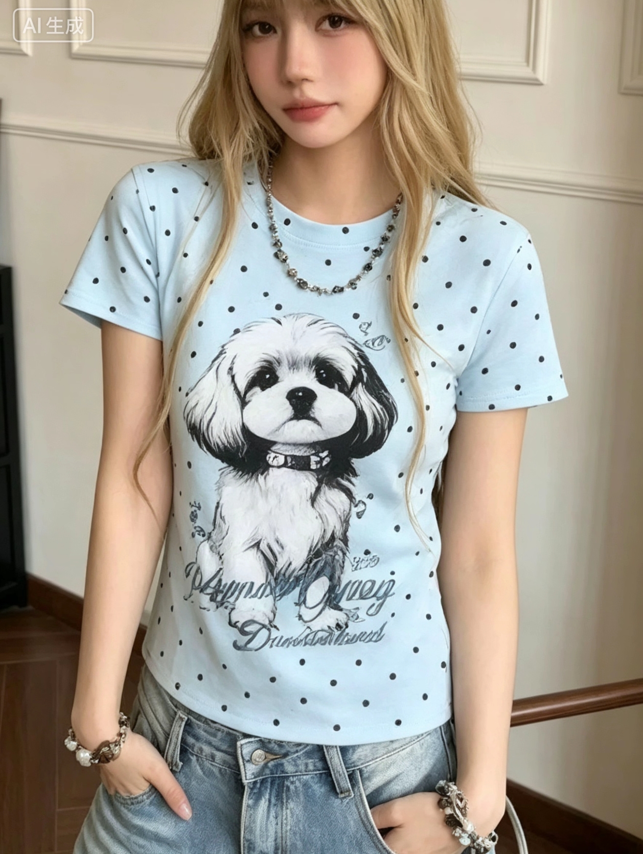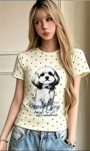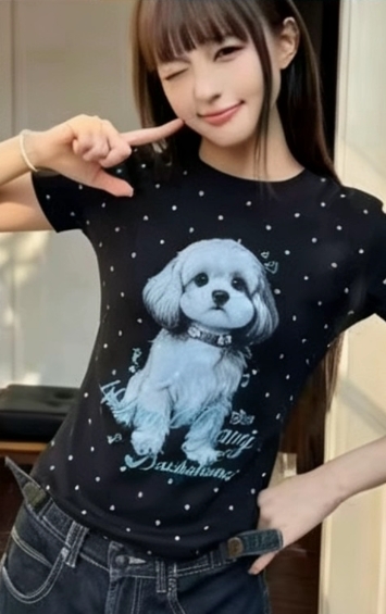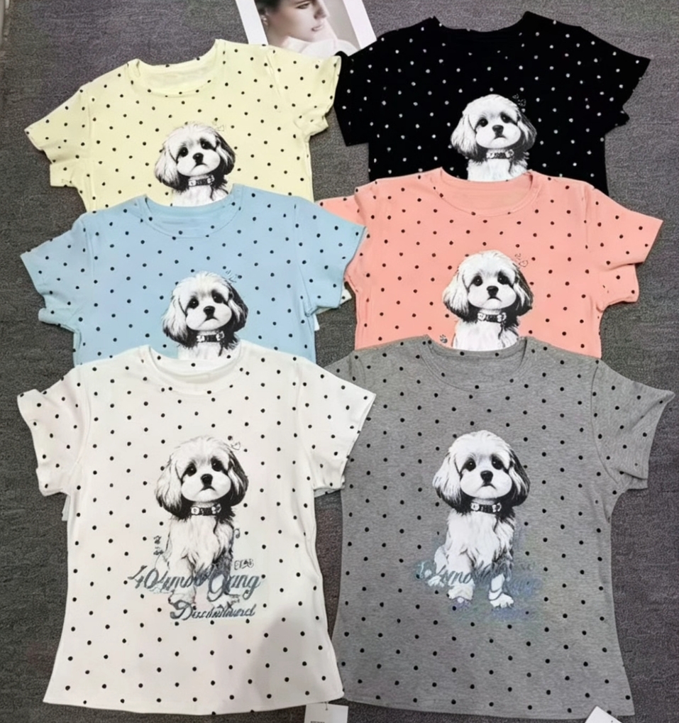 아메리칸 레트로 도트 무늬 강아지 프린트 반팔 티셔츠 여성 여름 디자인 센스 작은 대중 몸매 가꾸기 긍정적 인 어깨 쇼트 스타일 맨위