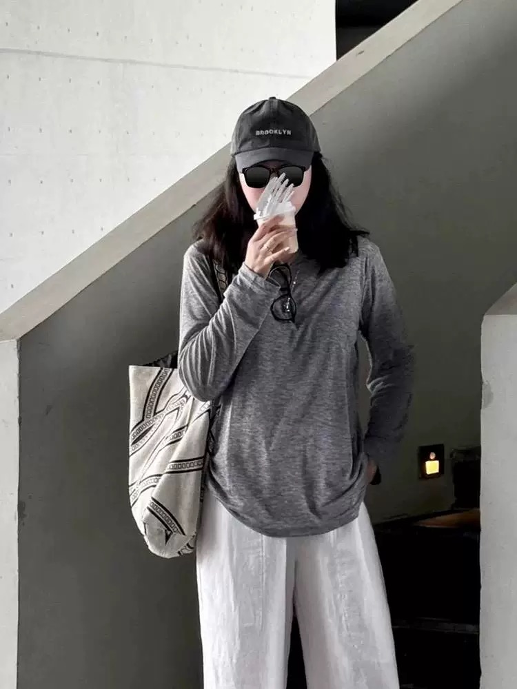 여성 의류 한 부서 회색 Tulle 긍정적 인 어깨 긴팔 티셔츠 블라우스 여성 여름 얇고 가벼운 외부 가져 가라. 느슨함 센스 자외선 차단 에어컨