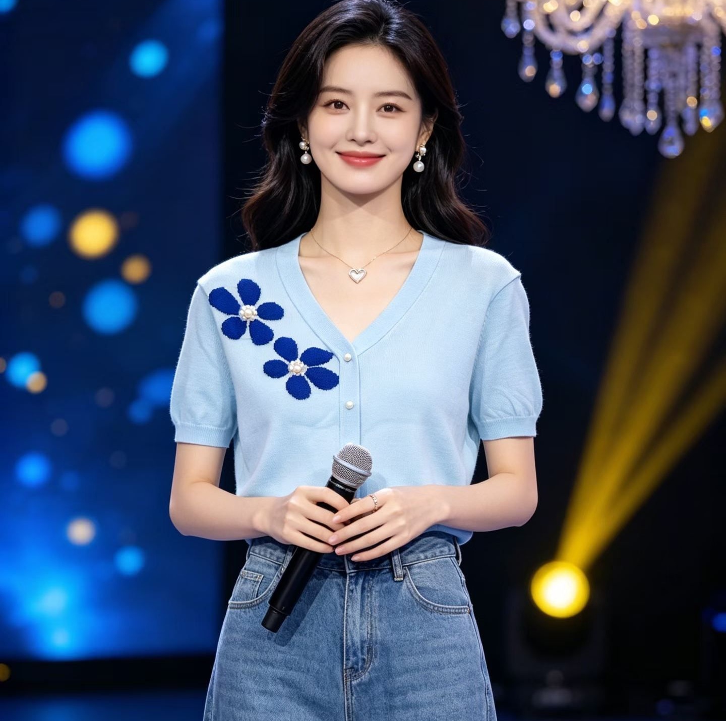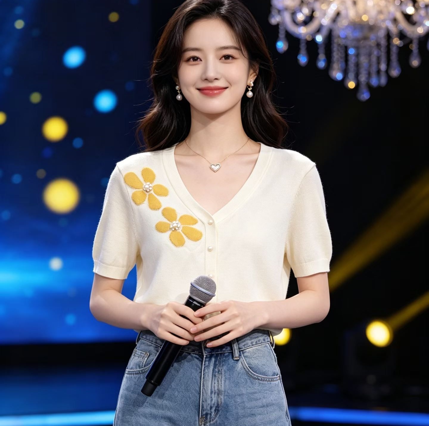 2026 년 여름 새로운 디자인 센스 한 부서 외국 가스 V넥 꽃 자카드 비즈 박기 니트 반팔 오픈 가디건