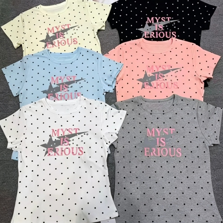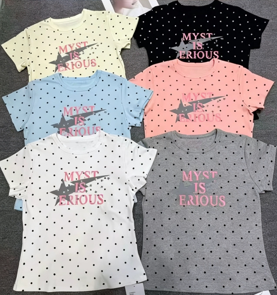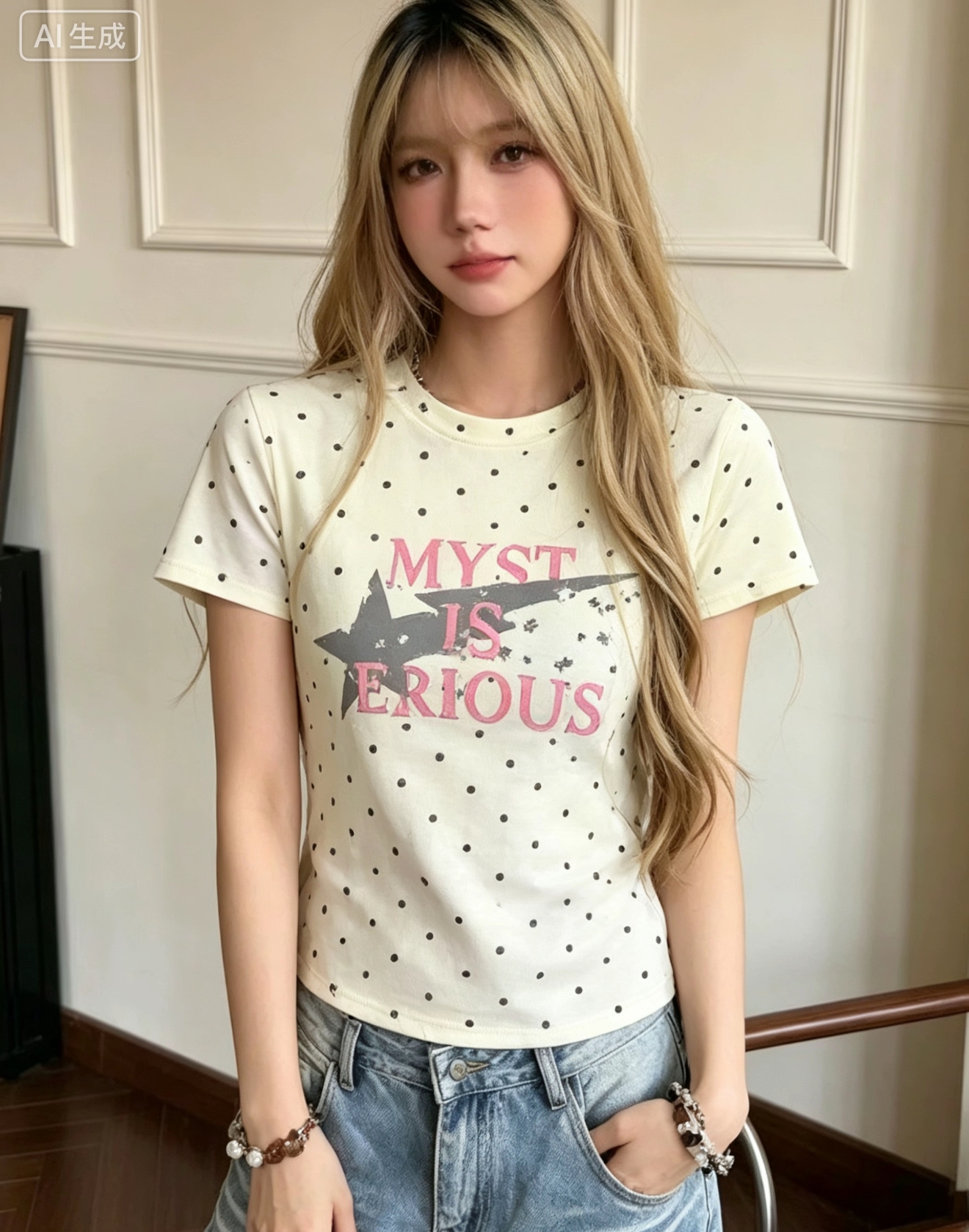 아메리칸 알파벳 프린트 도트 무늬 반팔 티셔츠 여성 여름 새로운 캐주얼 몸매 가꾸기 슬림해 보이는 연령 감소 섹션 라운드 넥 맨위