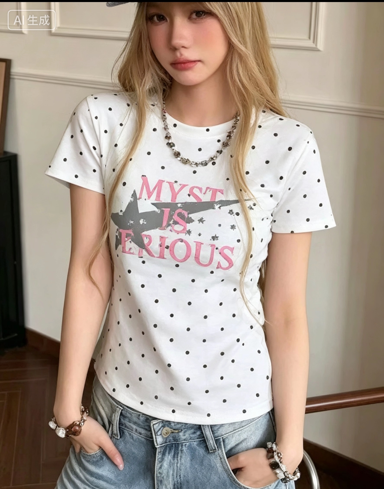 아메리칸 알파벳 프린트 도트 무늬 반팔 티셔츠 여성 여름 새로운 캐주얼 몸매 가꾸기 슬림해 보이는 연령 감소 섹션 라운드 넥 맨위