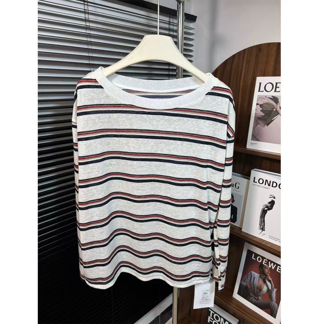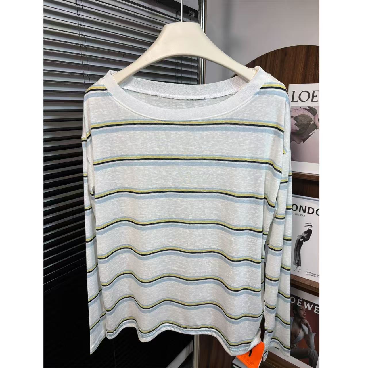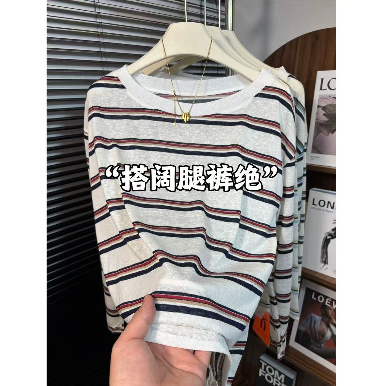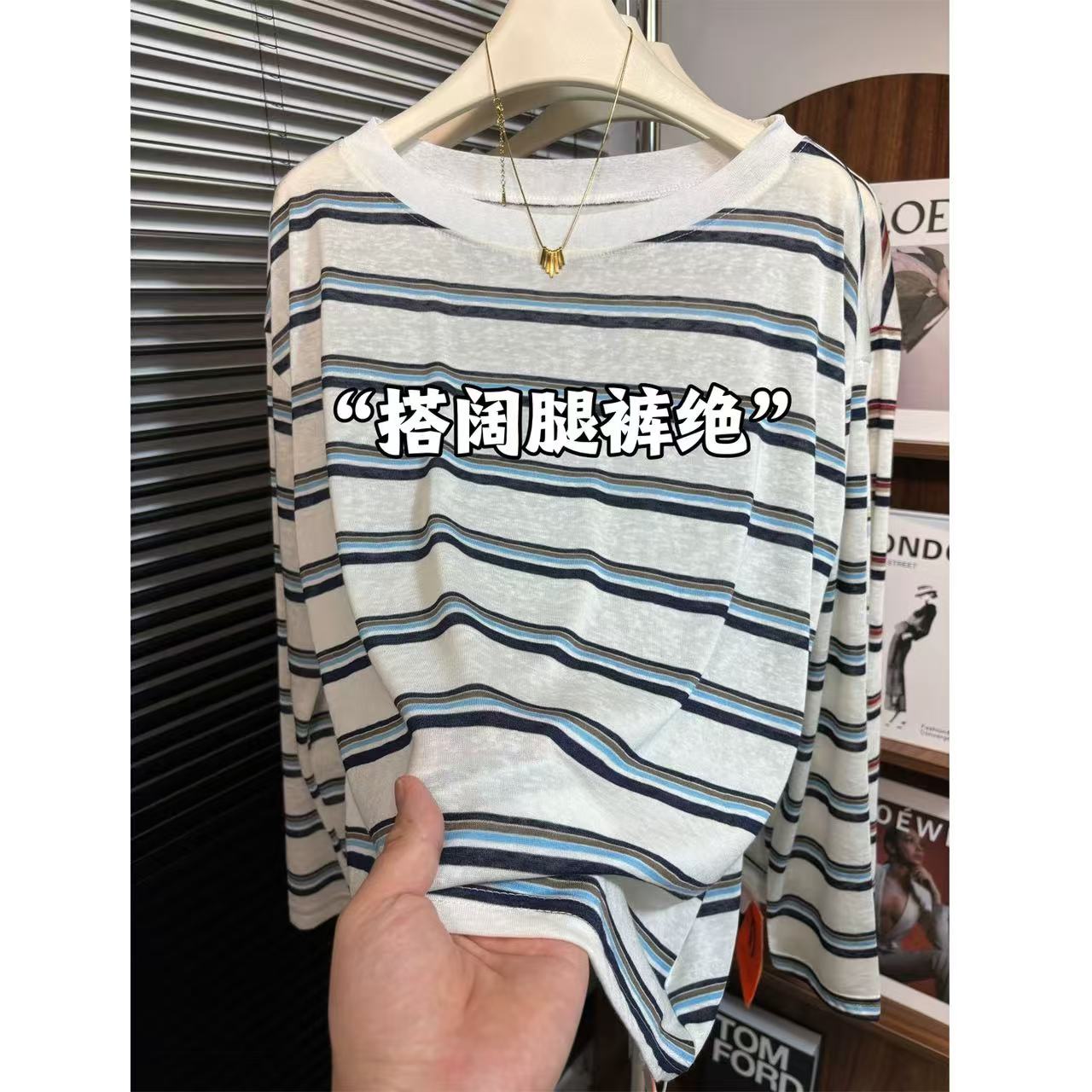 한국 스타일 루즈핏 느긋한 매듭 디자인 센스 스트라이프 라운드 넥 자외선 차단 긴팔 티셔츠 여성 얇은 스타일 슬림해 보이는 블라우스 맨위