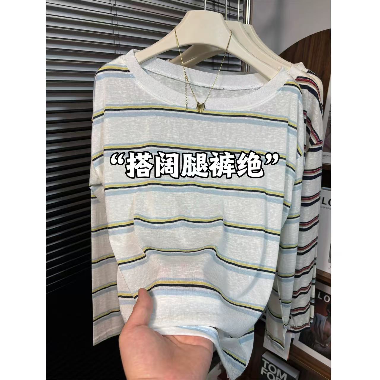 여름 얇은 스타일 태양 보호 셔츠 루즈핏 라이 경기 서울 주간 실크 스트라이프 긴팔 티셔츠 여성 셔츠 에어컨 셔츠 외출용 블라우스