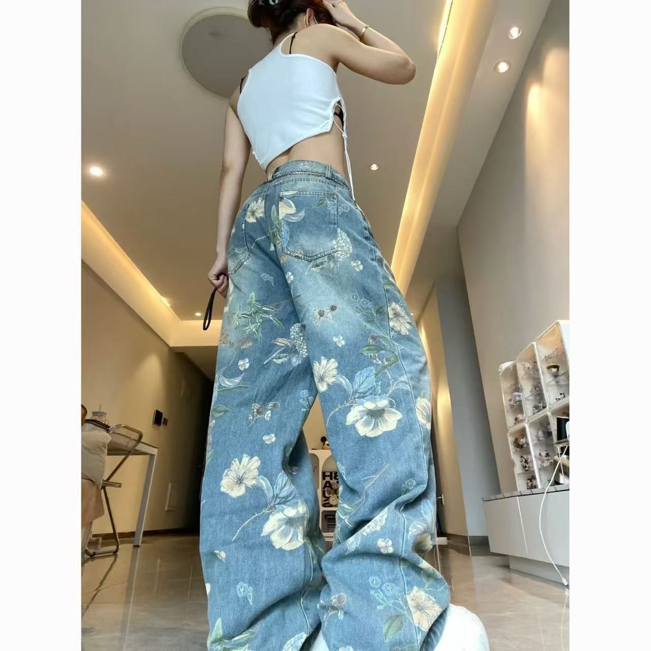 꽃무늬 프린트 청바지 여성 아메리칸 레트로 와이드 레그 팬츠 디자인 센스 작은 대중 루즈핏 바닥 청소 바지