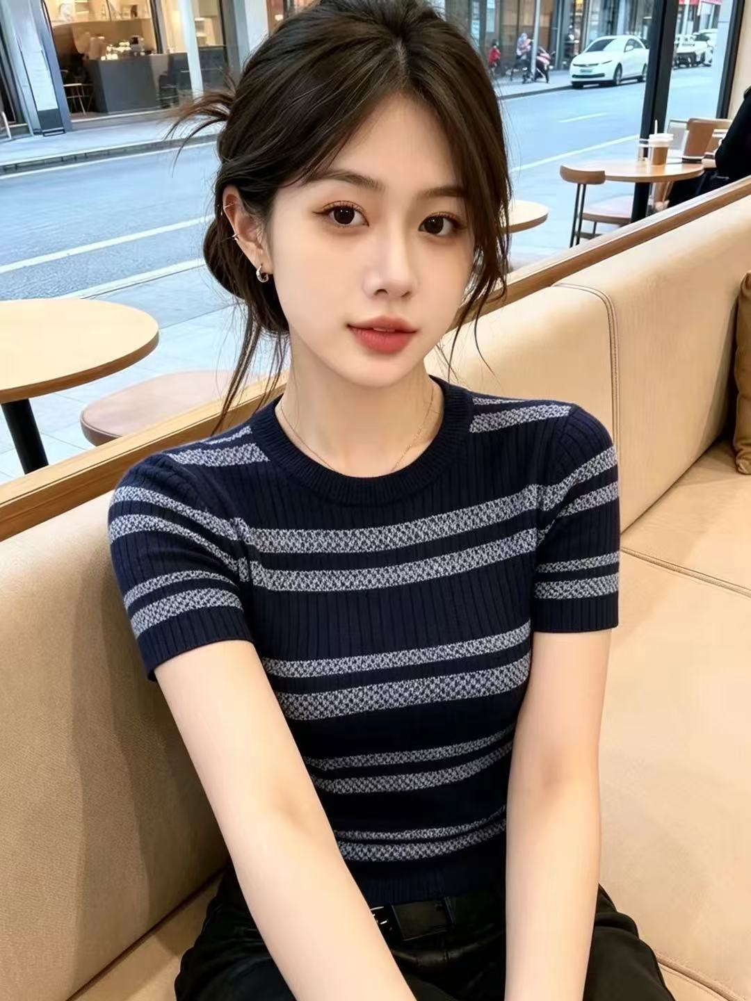 한 부서 라운드 넥 스트라이프 배색 반팔 니트 스웨터 여성 2026 여름 새로운 몸매 가꾸기 슬림해 보이는 패션 외국 가스 맨위