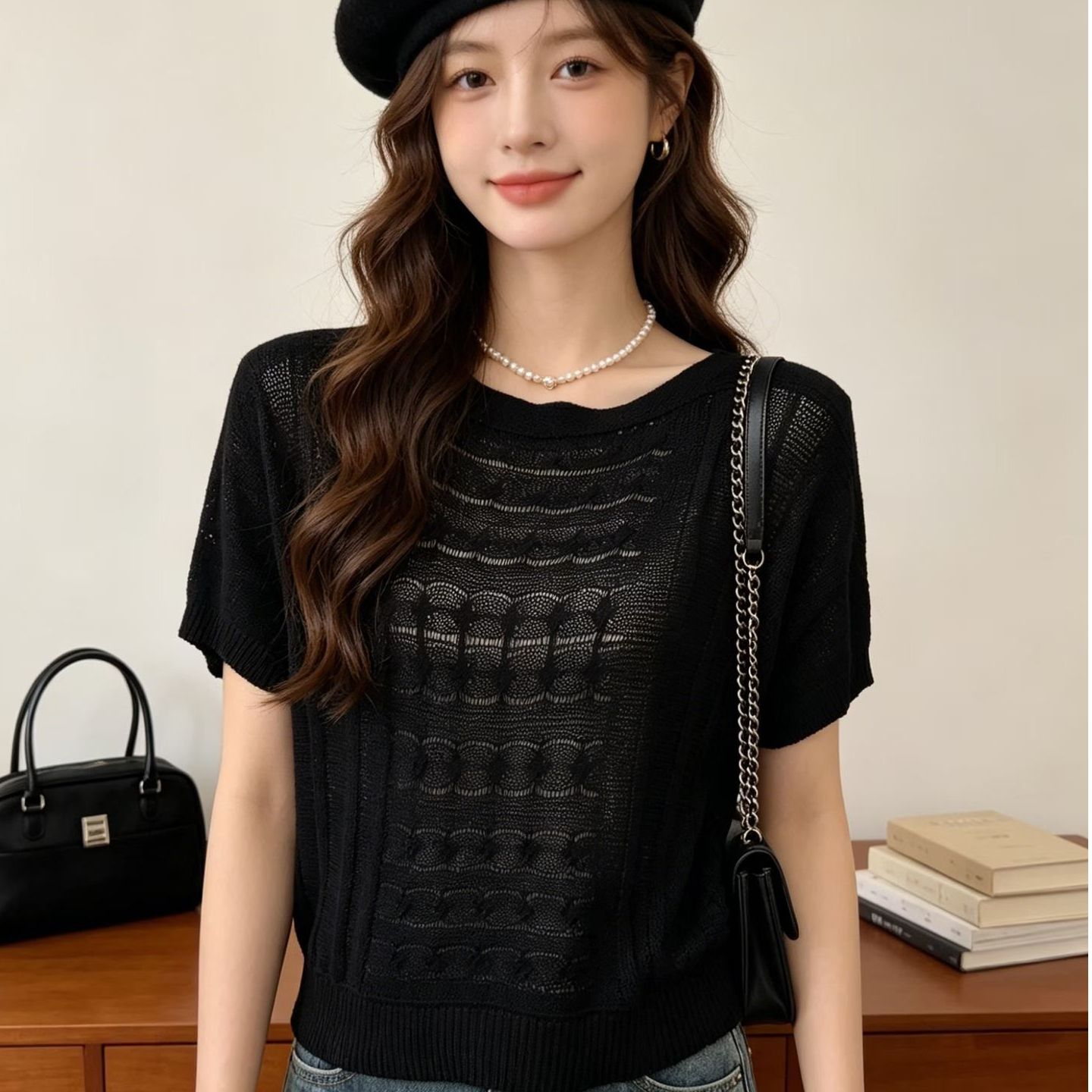 2026 여름 새로운 디자인 센스 한 부서 패션 라운드 넥 홀로우 아웃 니트 단색 커프스 단추 나비 매듭 풀오버 반팔