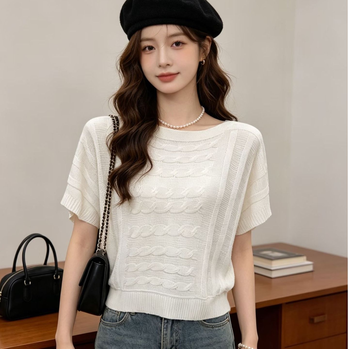 2026 년 여름 새로운 디자인 센스 순수한 욕망 바람 오프숄더 마이크로 ~을 통해 꽈배기 니트 배트윙 소매 풀오버 맨위