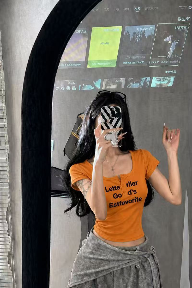 섹시함 백리스 알파벳 프린트 u 칼라 반팔 티셔츠 여성 여름 새로운 순수한 욕망 핫걸 바람 몸매 가꾸기 슈퍼 잘 생긴 맨위