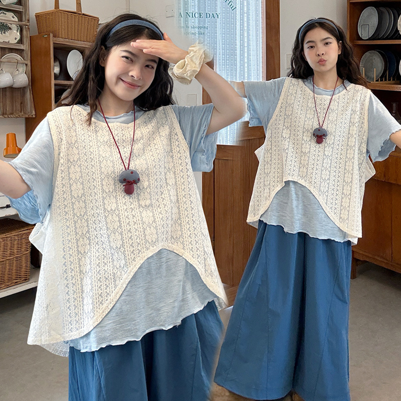 실사 2026 여름 드레스 새로운 레이스 레이스 블라우스 조끼 반팔 티셔츠 레이스 치마 출산 착용 3종 세트