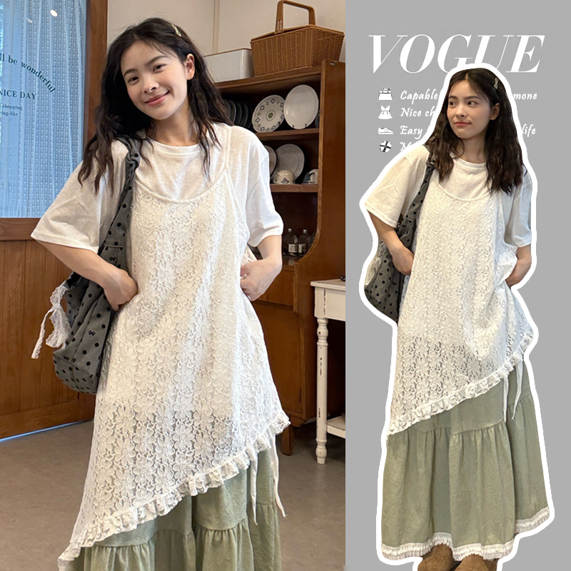 실사 2026 여름 섹션 임산부 자수 레이스 슬립 드레스 스택 착용 화이트 티셔츠 레이스 반 스커트 세트