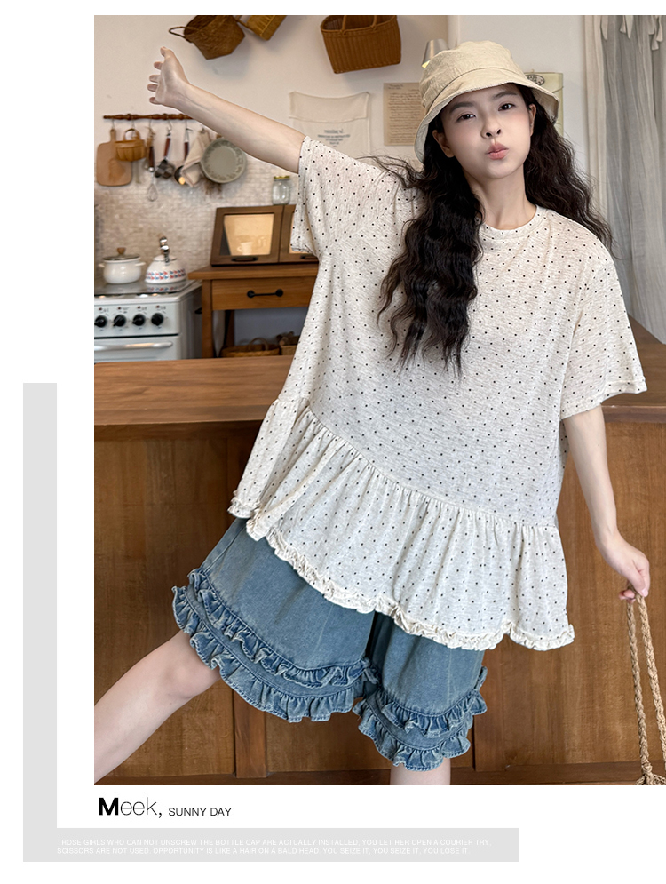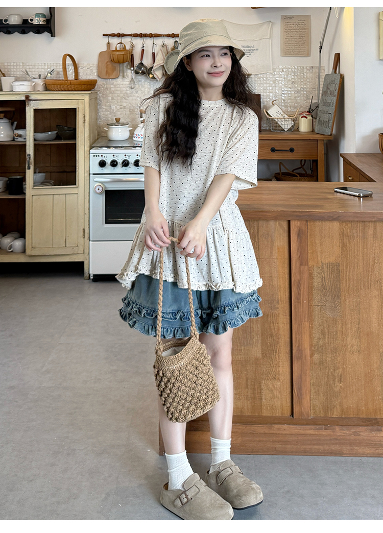 실사 지금 2026 여름 새로운 품격 도트 무늬 반팔 레트로 데님 멜빵 치마 세트