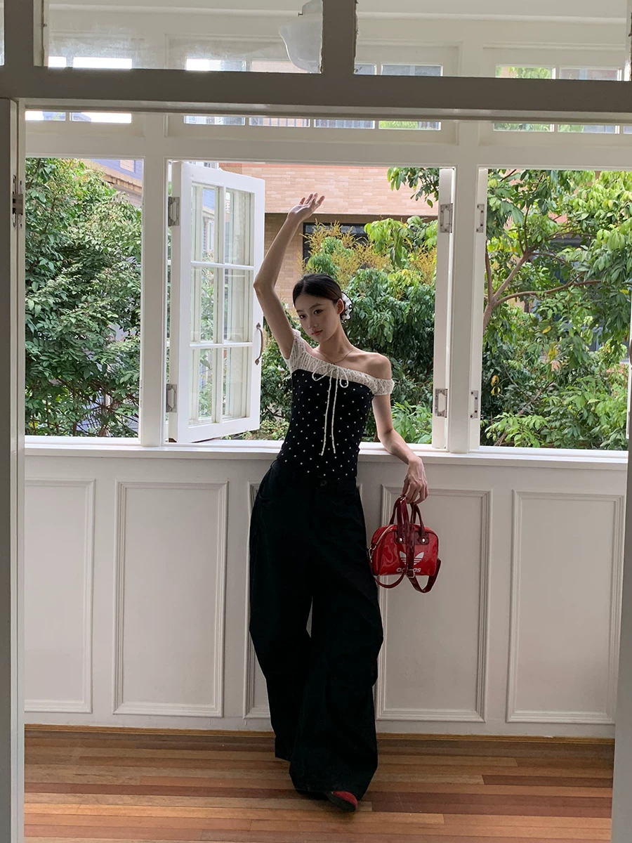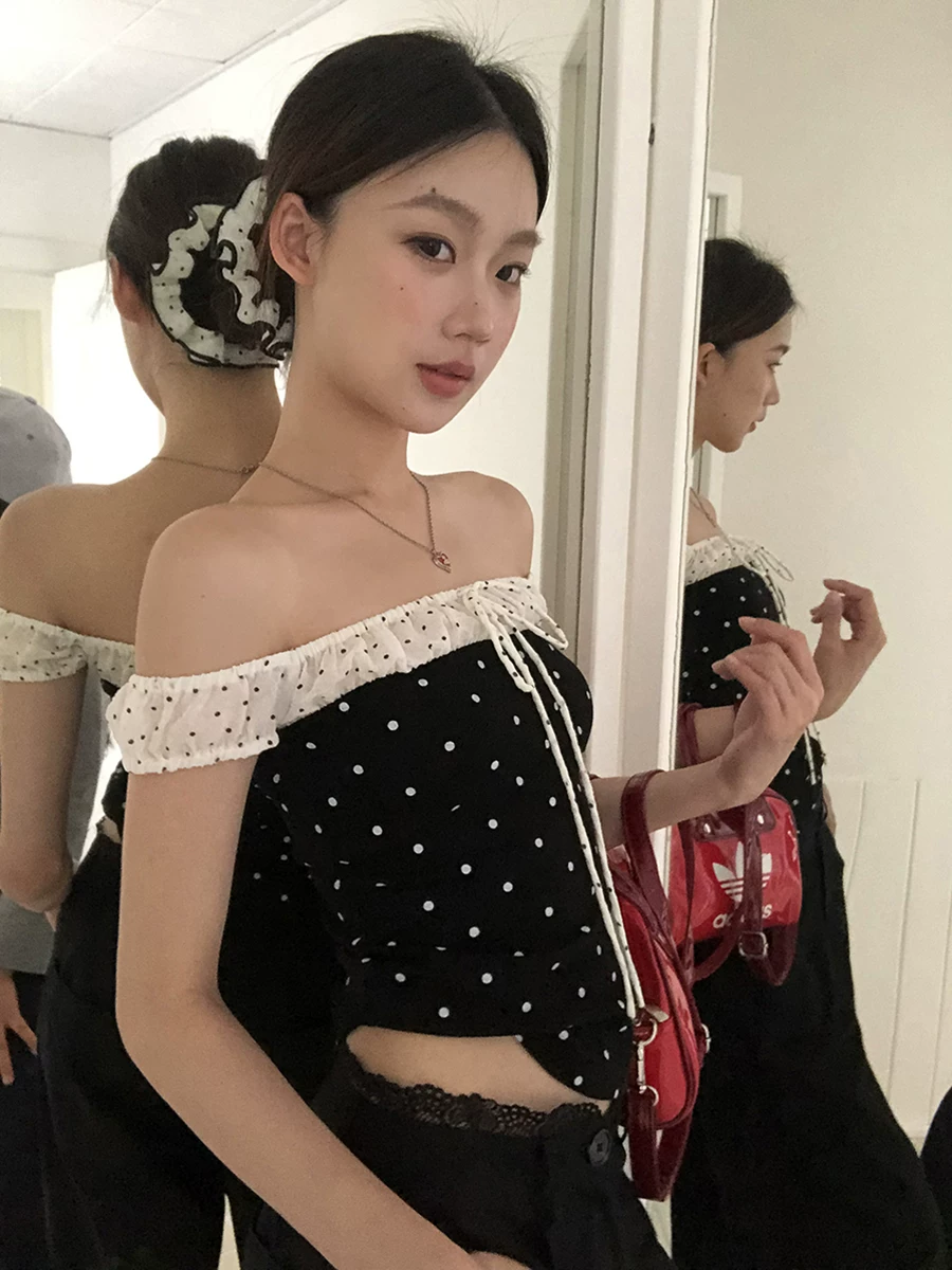40 차가운 실크 코튼 220 그램 프랑스식 배색 도트 무늬 오프숄더 반팔 티셔츠 여성 여름 디자인