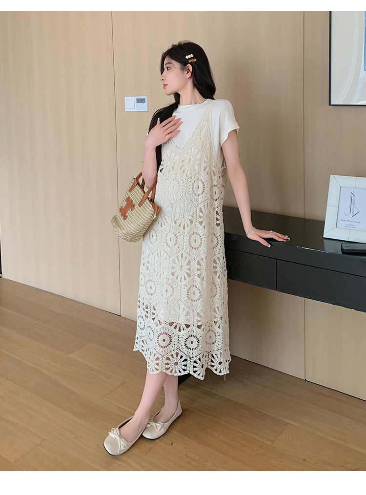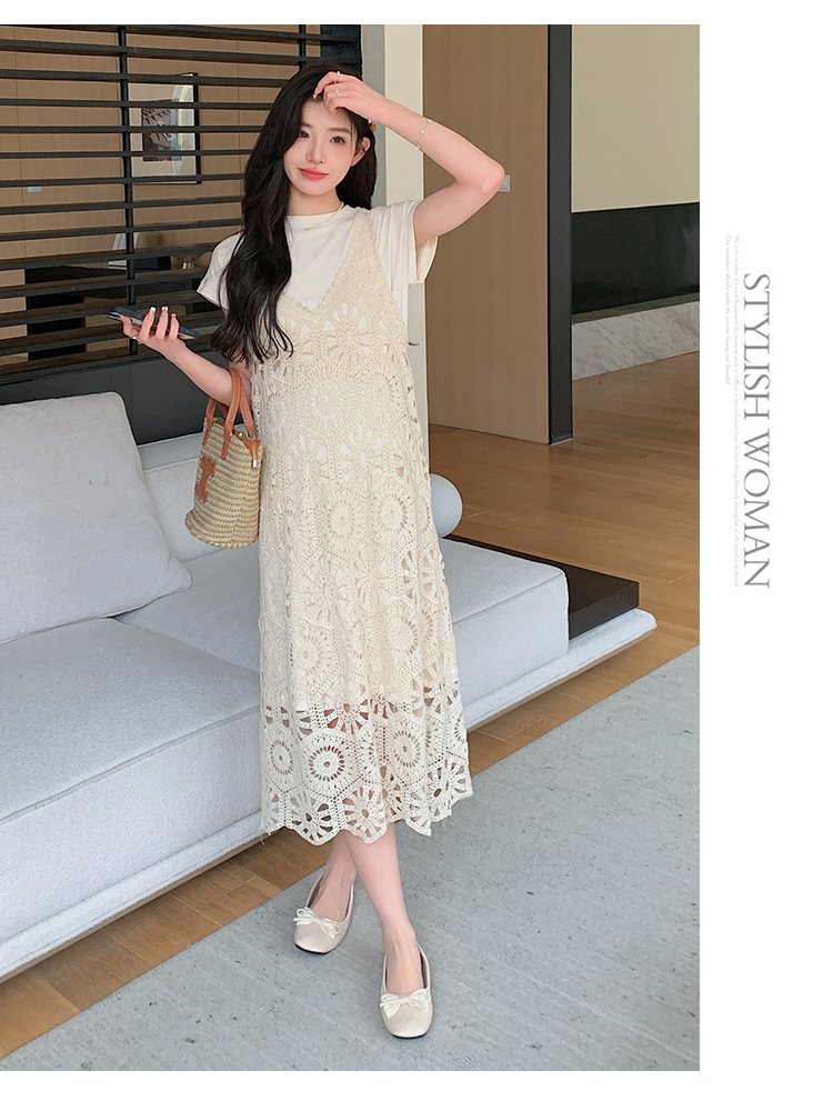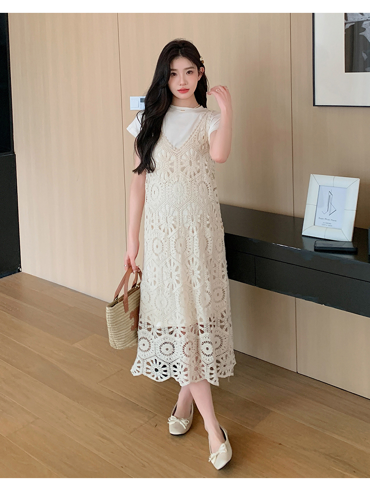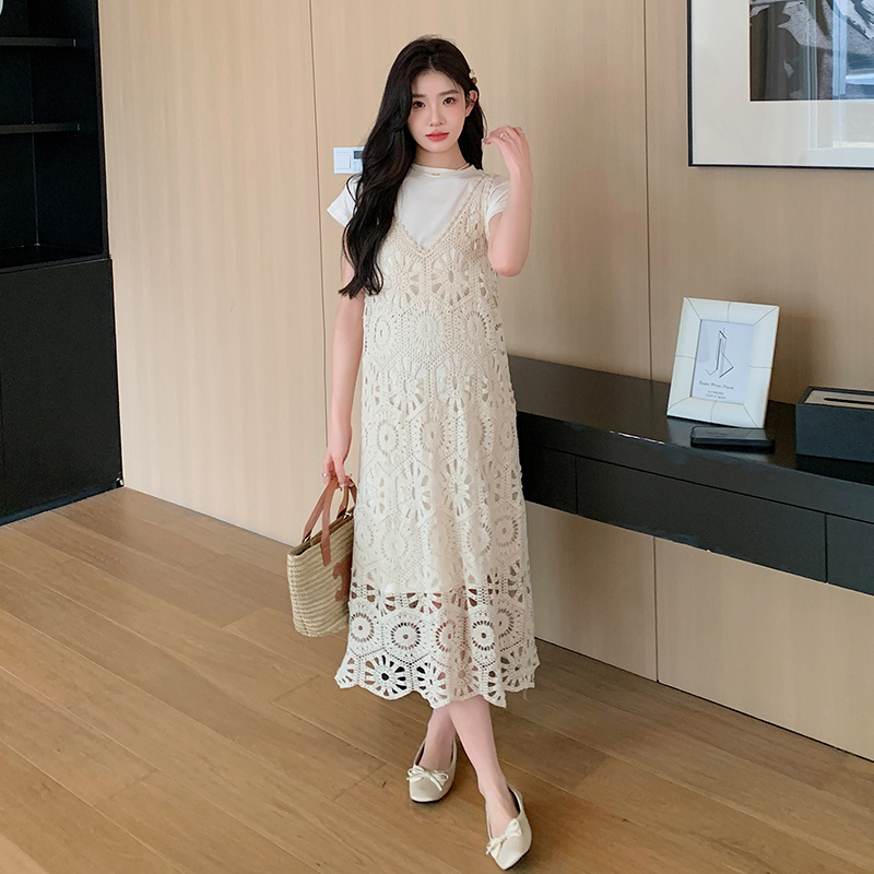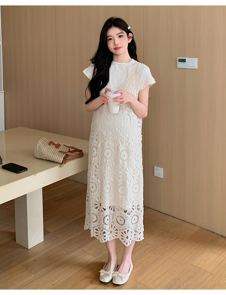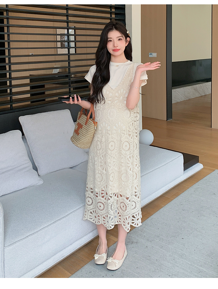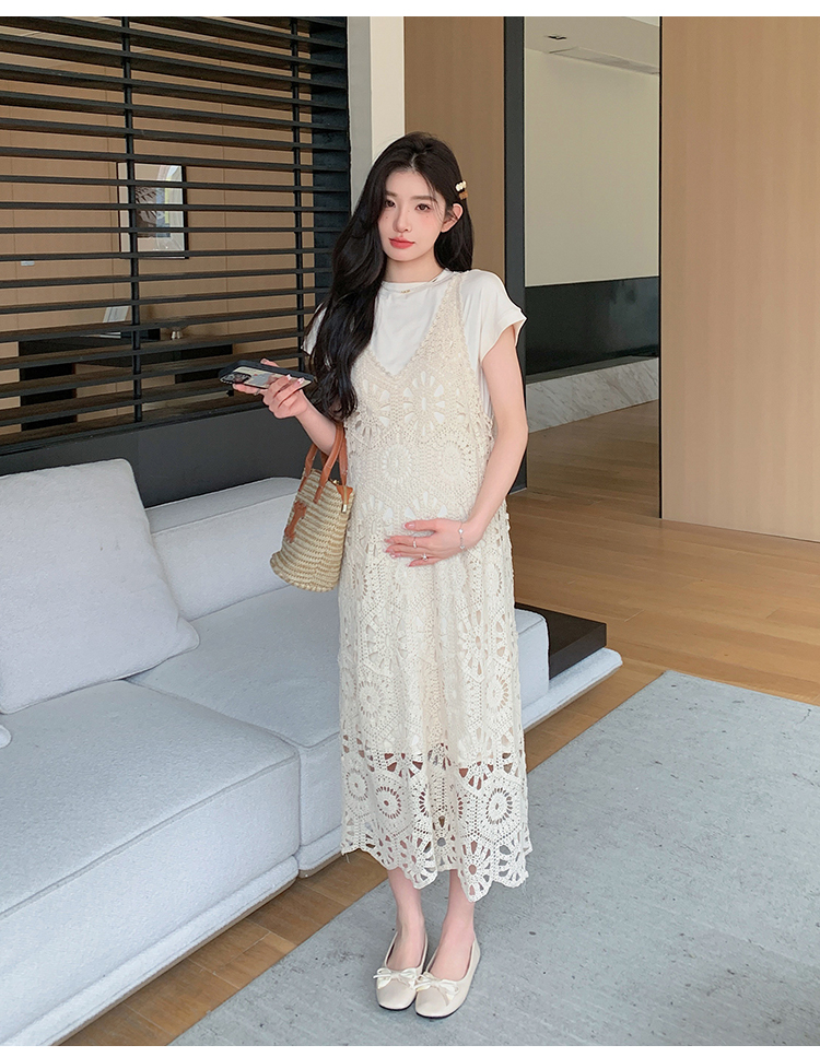 실사 임산부 여름 세트 프랑스식 안개 에 꽃 홀로우 아웃 품격 레이스 슬립 드레스 투피스 세트 트렌디