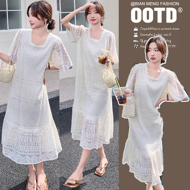 실사 임산부 여름 드레스 새로운 광장 칼라 홀로우 아웃 레이스 드레스 임신 품격 슬림해 보이는 인어 꼬리 치마