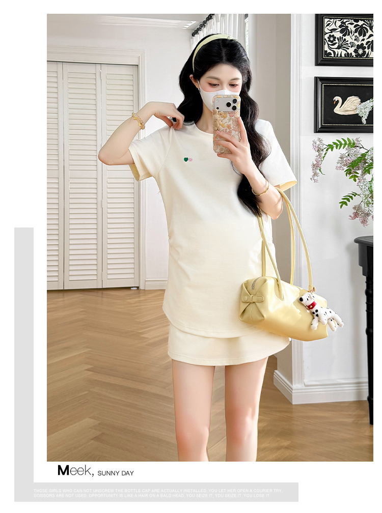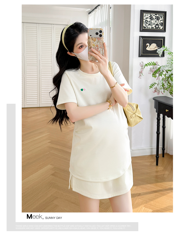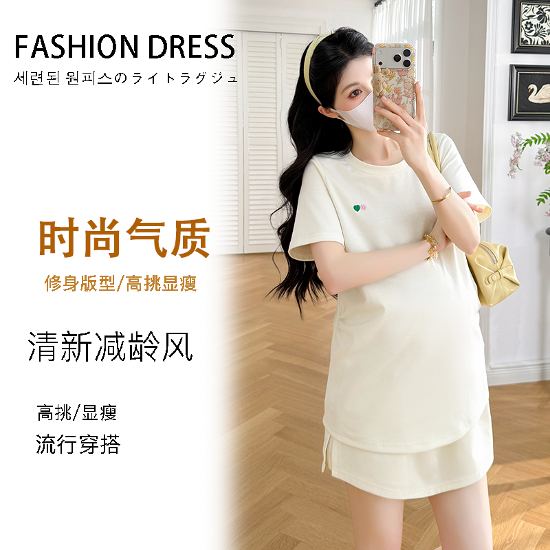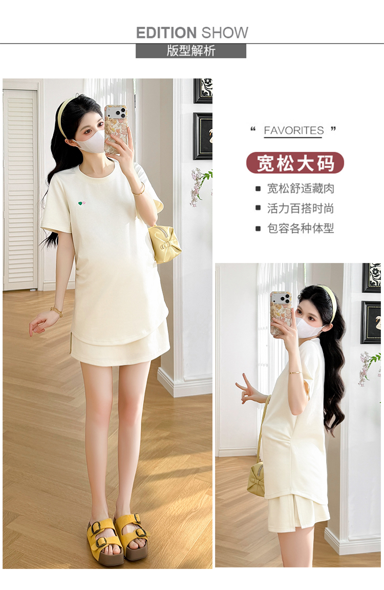 실사 작은 동영상 여름 새로운 임산부 페이크 레이어드 후드 반팔 티셔츠 복부 지지 반바지 투피스 세트 세트