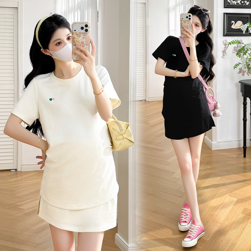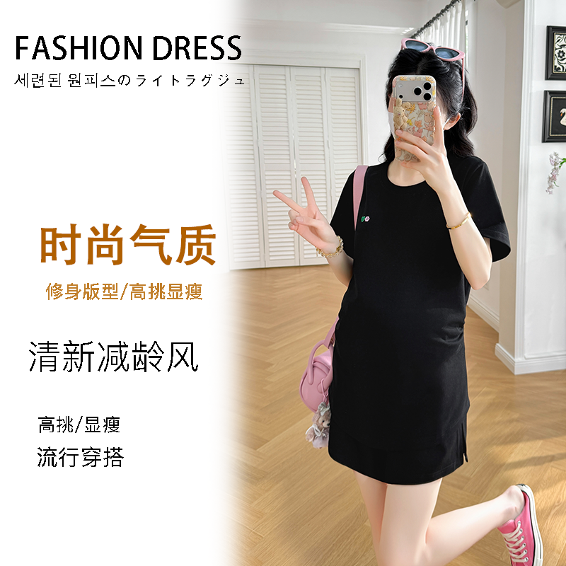 실사 지금 지금 2026 임산부 새로운 라운드 넥 알파벳 반팔 티셔츠 길다 치마 여름 루즈핏 캐주얼 드레스