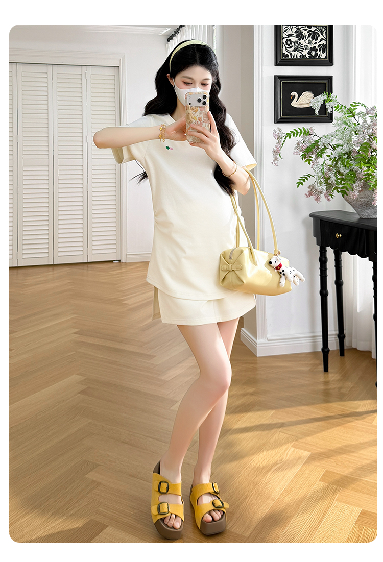 실사 2026 임산부 세트 여름 새로운 배색 POLO 칼라 반팔 맨위 복부 지지 바지 반바지 투피스 세트